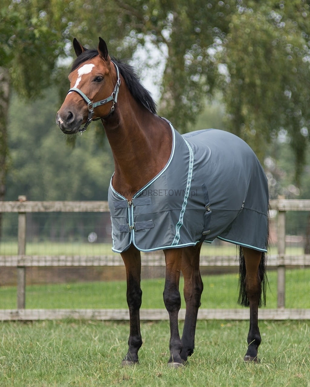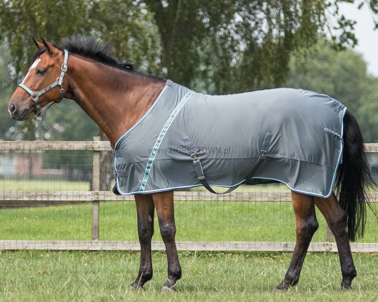 Cienka letnia derka z chłodnej siatki, który idealnie nadaje się do użycia podczas transportu lub po jeździe. Krawędzie ozdobione są dwukolorowym ozdobnym sznurkiem. Derka ma szczeliny do chodzenia, co zapewnia dobrą swobodę ruchów.