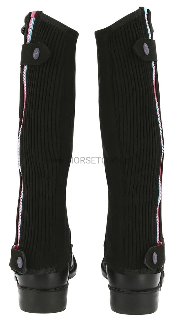 Kształtowane czapsy z Amara (bardzo wytrzymały materiał syntetyczny, delikatny, elastyczny i nadający się do prania: 65% nylon i 35% poliuretan). Elastyczne zakładki na podbiciu i z tyłu łydki, pokryte Amara. Zapięcie na suwak z zakładkami na zatrzaski u góry iu dołu. Elastyczne paski na stopy ze wzmocnieniami Amara.