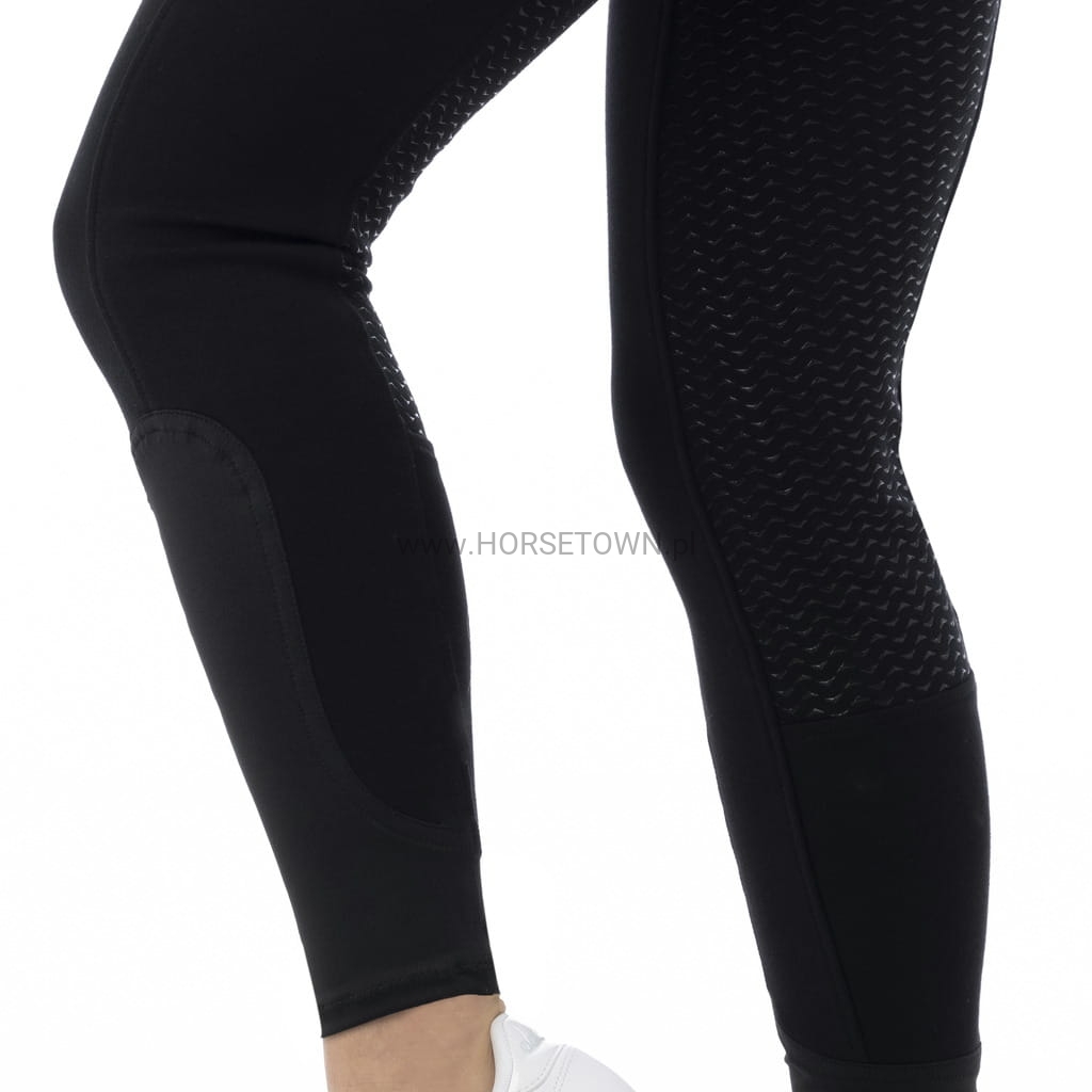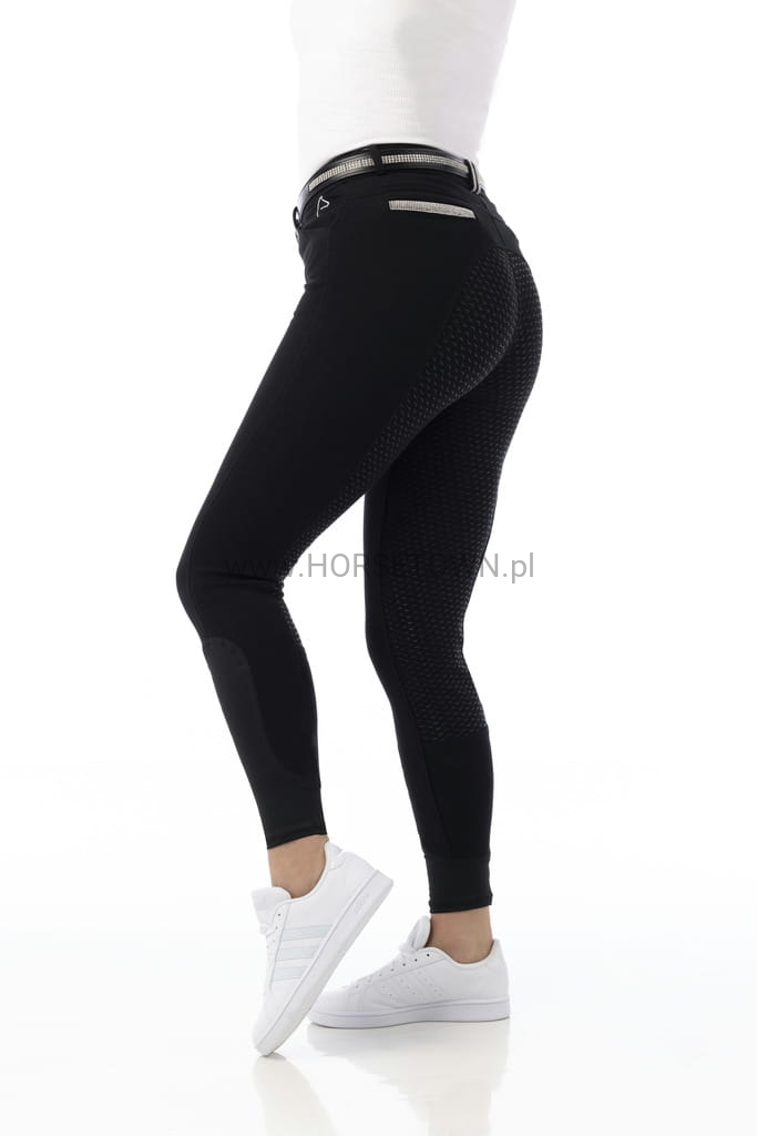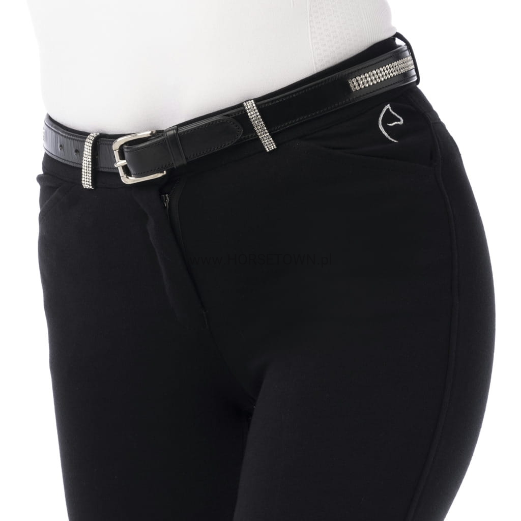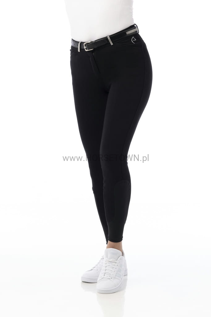 Wygodne bryczesy, które dodają szyku stylizacji dzięki: pasowi ze szlufkami, imitacji kieszeni z tyłu ozdobionych tasiemką oraz zapinaniu na guziki również ozdobione tasiemką. Prosty krój z elastycznej bawełny ze skośnymi kieszeniami z przodu. Antypoślizgowe siedzisko z silikonowymi wkładkami zapewnia stałą pozycję nóg i niezrównany chwyt siodło, pas ze szlufkami i dolna część nogawki z elastanem. Skład: 95% bawełna, 5% elastan. Można prać w pralce w temperaturze 30°C.
