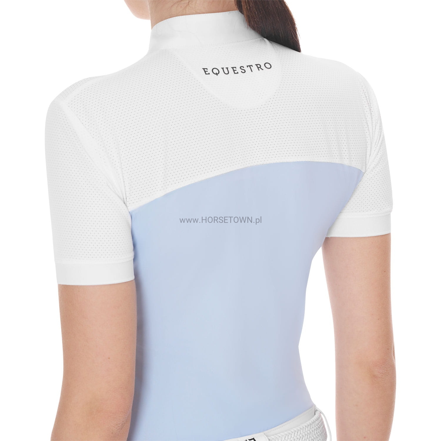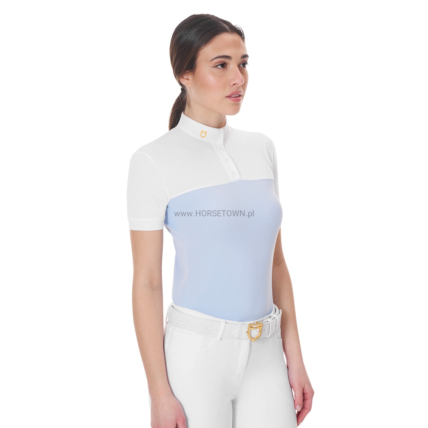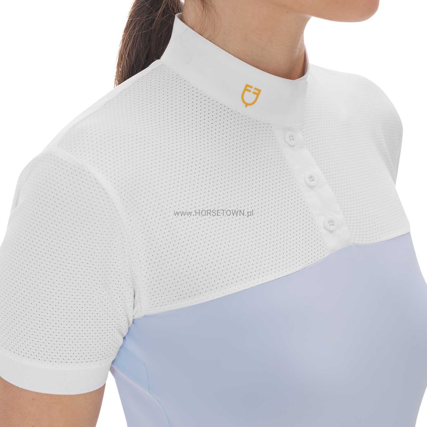 Koszula konkursowa damska o dopasowanym kroju z krótkim rękawem, wykonana z technicznej i siateczkowej tkaniny, która ułatwia odparowywanie i odprowadzanie potu.