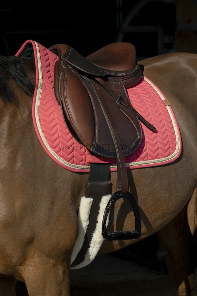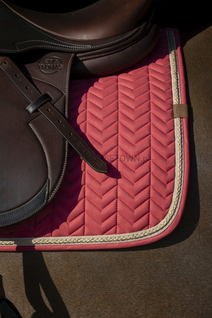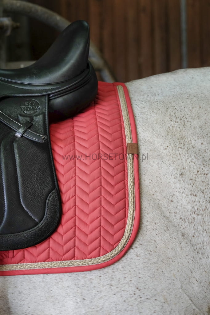 Miękki czaprak 100% poliester z wypełnieniem 200g/m2 i wypełnieniem z pianki o grubości 8mm. Ozdobiona warkoczem.