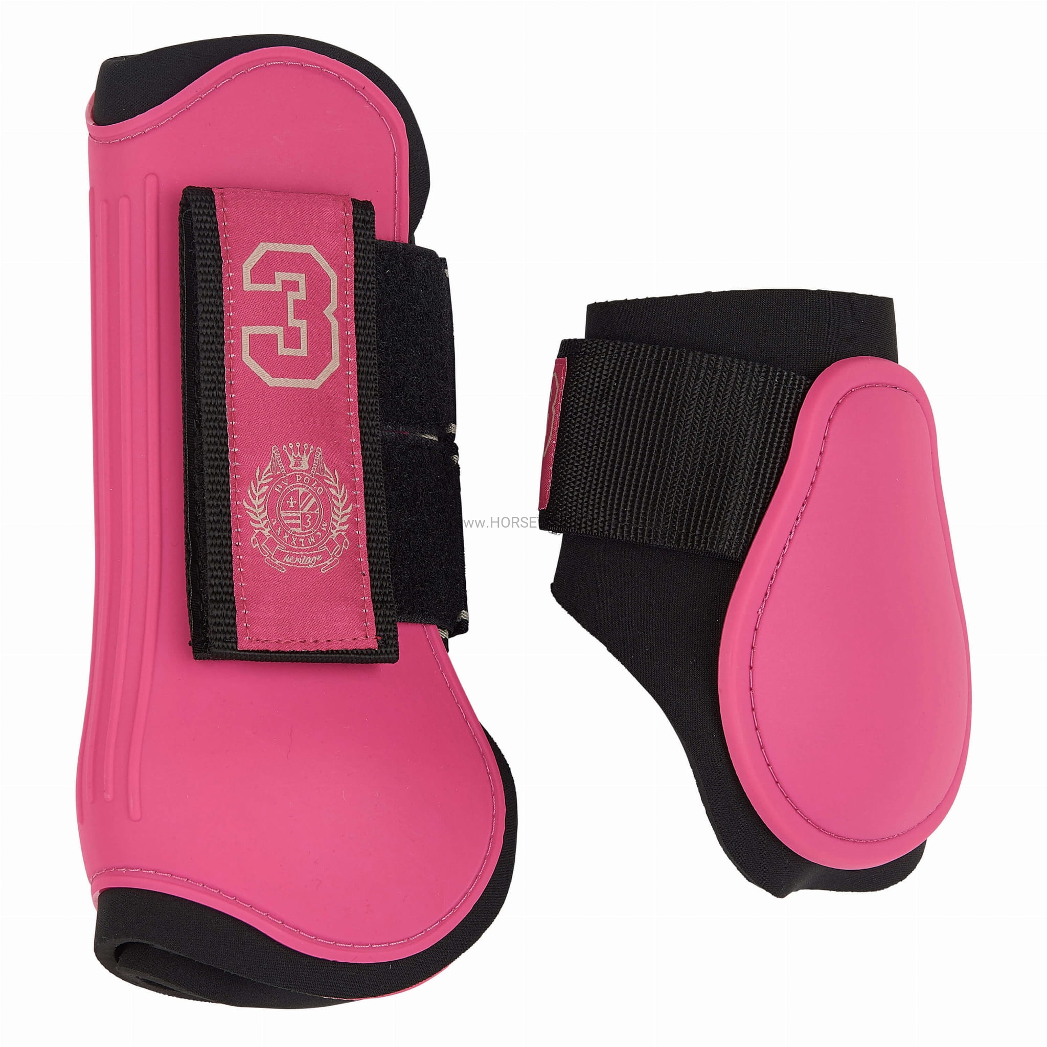 Ten wytrzymały zestaw ochraniaczy na ścięgna i pęciny wykonany jest z matowych plastikowych skorup, podszytych pochłaniającą wyściółką z neoprenu i wyposażonych w paski mocujące z taśmą dotykową. Na tkanej metce znajduje się haftowana grafika, która nadaje stylowy wygląd. Te buty są wygodne i chronią nogi konia, a jednocześnie są oddychające i stylowe.