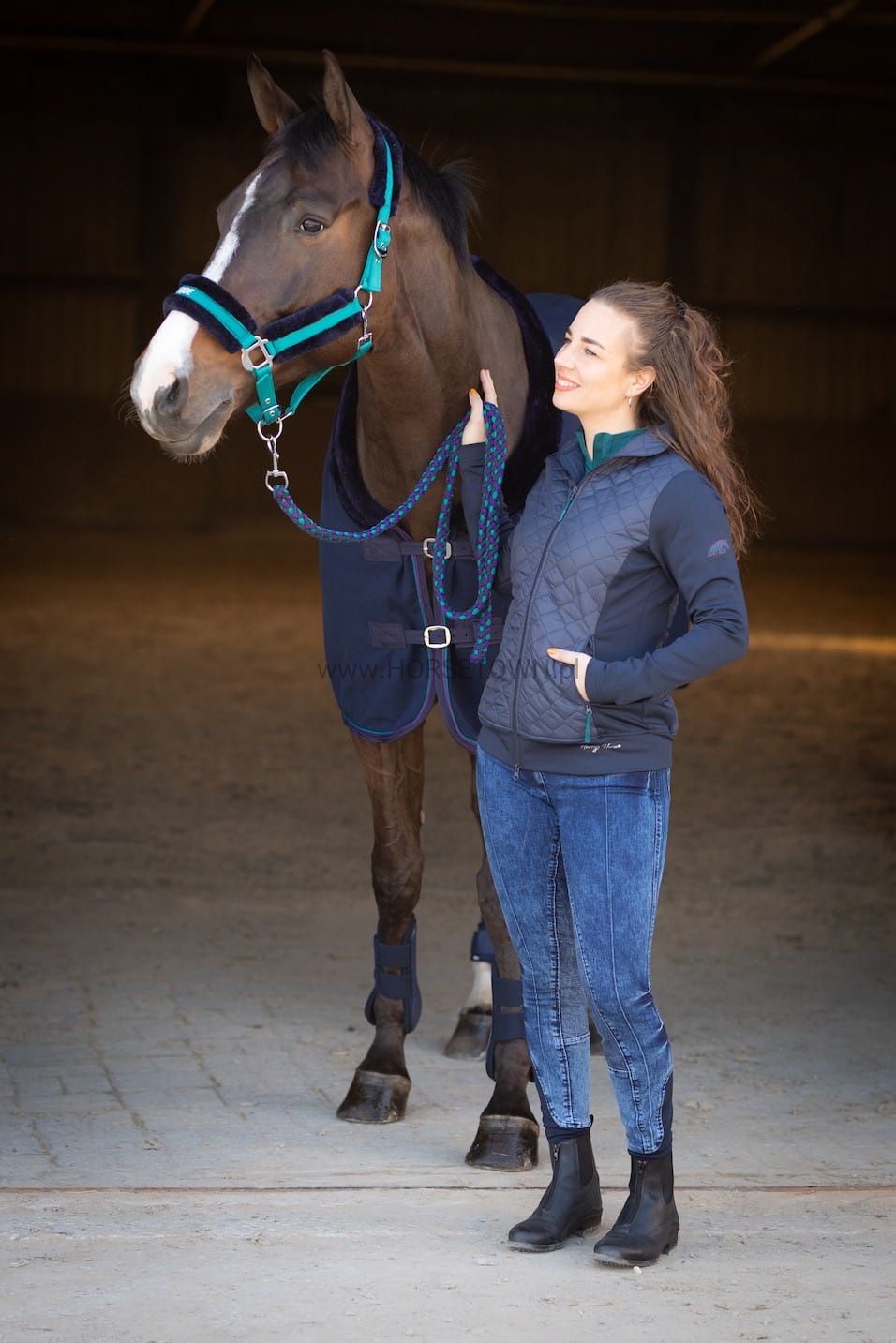 Denimowe bryczesy jeździeckie z kieszeniami bocznymi i kieszeniami tylnymi, obie z kolorowymi ćwiekami, z pełnym silikonowym lejem zapewniającym lepszą przyczepność w siodle, naszywka clarino z logo Just Ride z tyłu, „elastyczne nogawki” dla dodatkowego komfortu buty do jazdy konnej