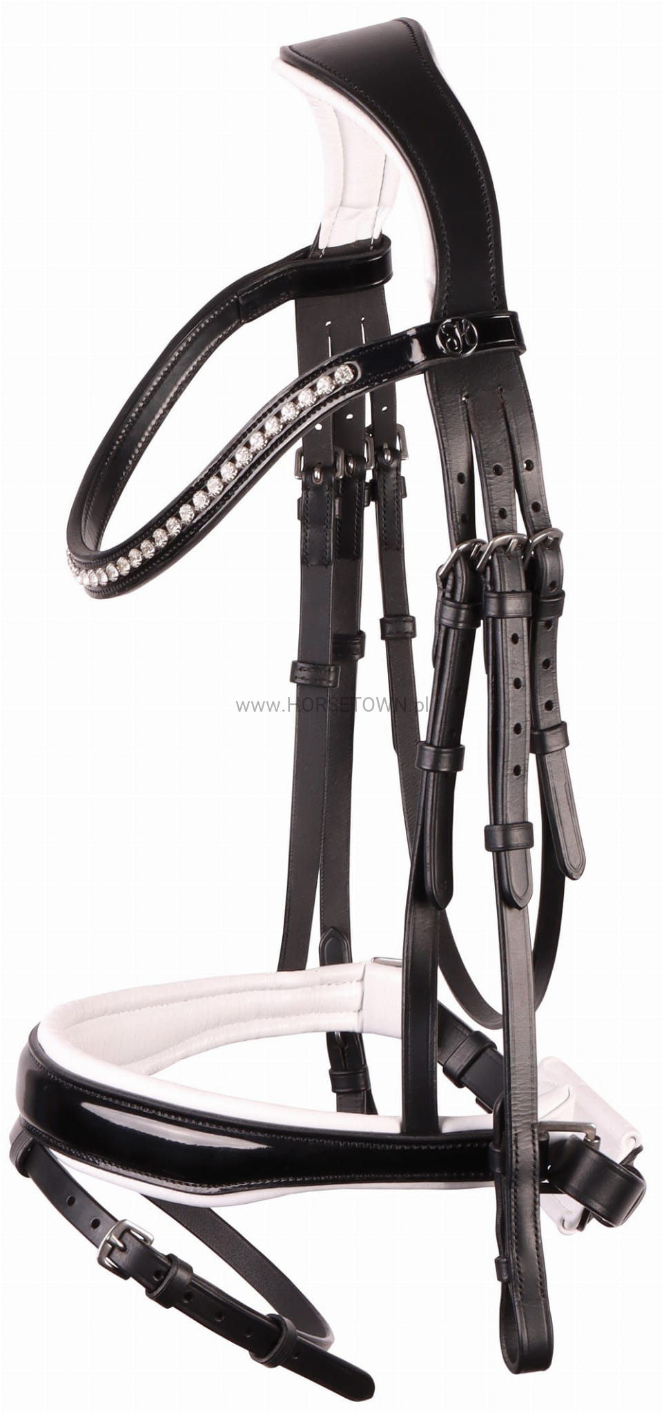 skórzane ogłowie z kombinowanym nachrapnikiem. Luksusowy, szeroki, nakładany nachrapnik z lakierem ma szerokość 4CM (z białą wyściółką) i jest anatomicznie ukształtowany wokół wędzidła. Ze specjalnym, anatomicznym, miękko wyściełanym nagłowkiem. Eleganckie wąskie ramiączka m.in. do paska pod szyję. Wyposażony w luksusowy, wiszący naczółek z lakierem i pięknymi kryształkami AB. Zaślepki na policzkach i wodzach.