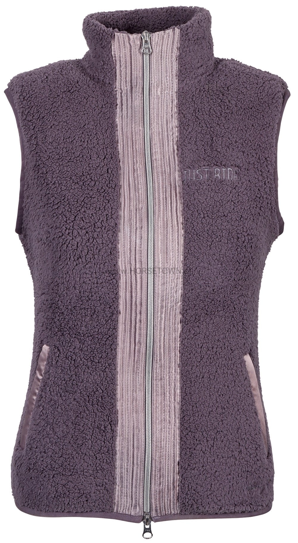 Kamizelka ocieplająca wykonana z miękkiego materiału polarowego typu teddy i satynowych detali, dwukierunkowy zamek błyskawiczny i dwie kieszenie zapinane na zamek oraz logo Just Ride na piersi.