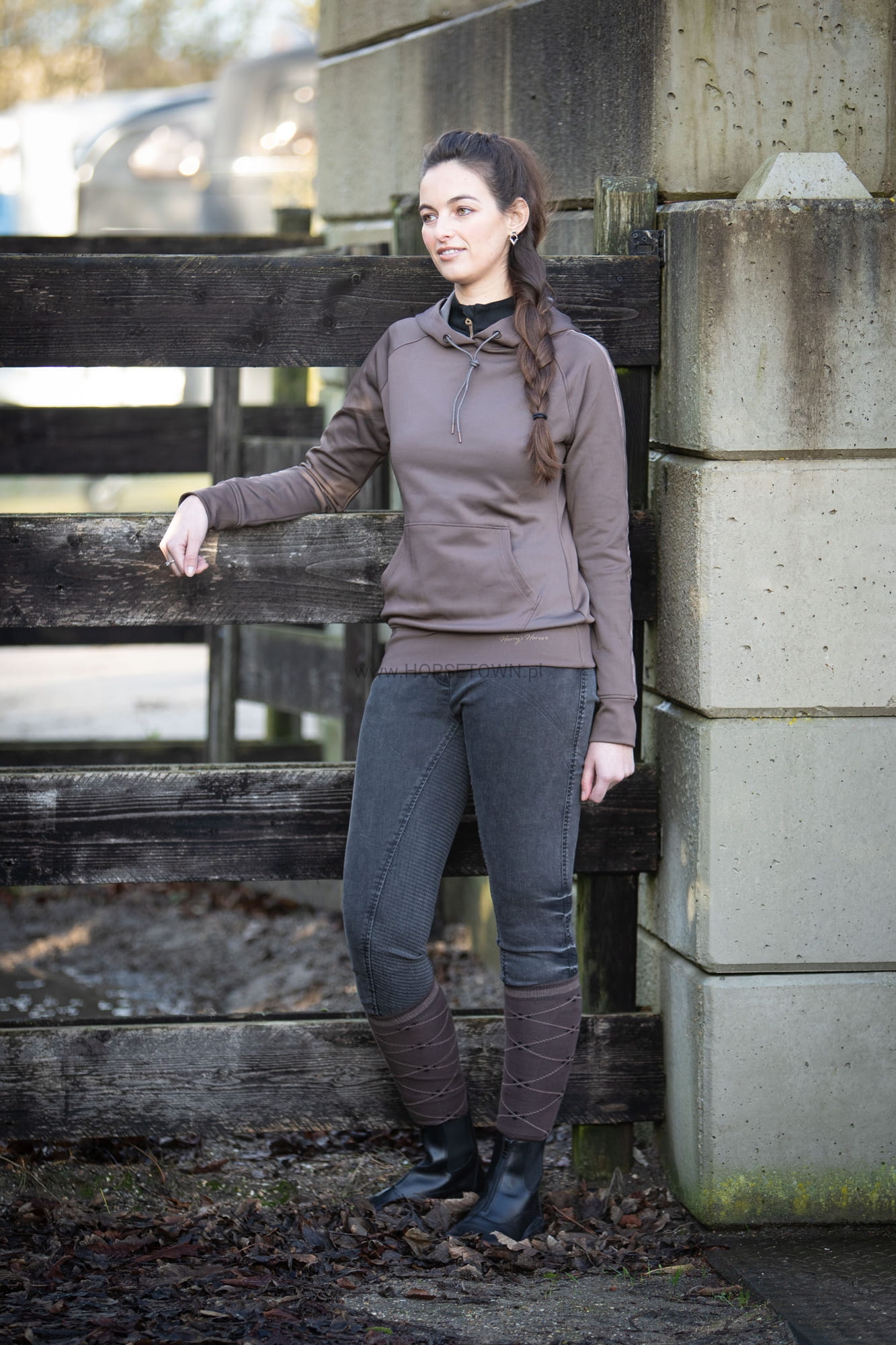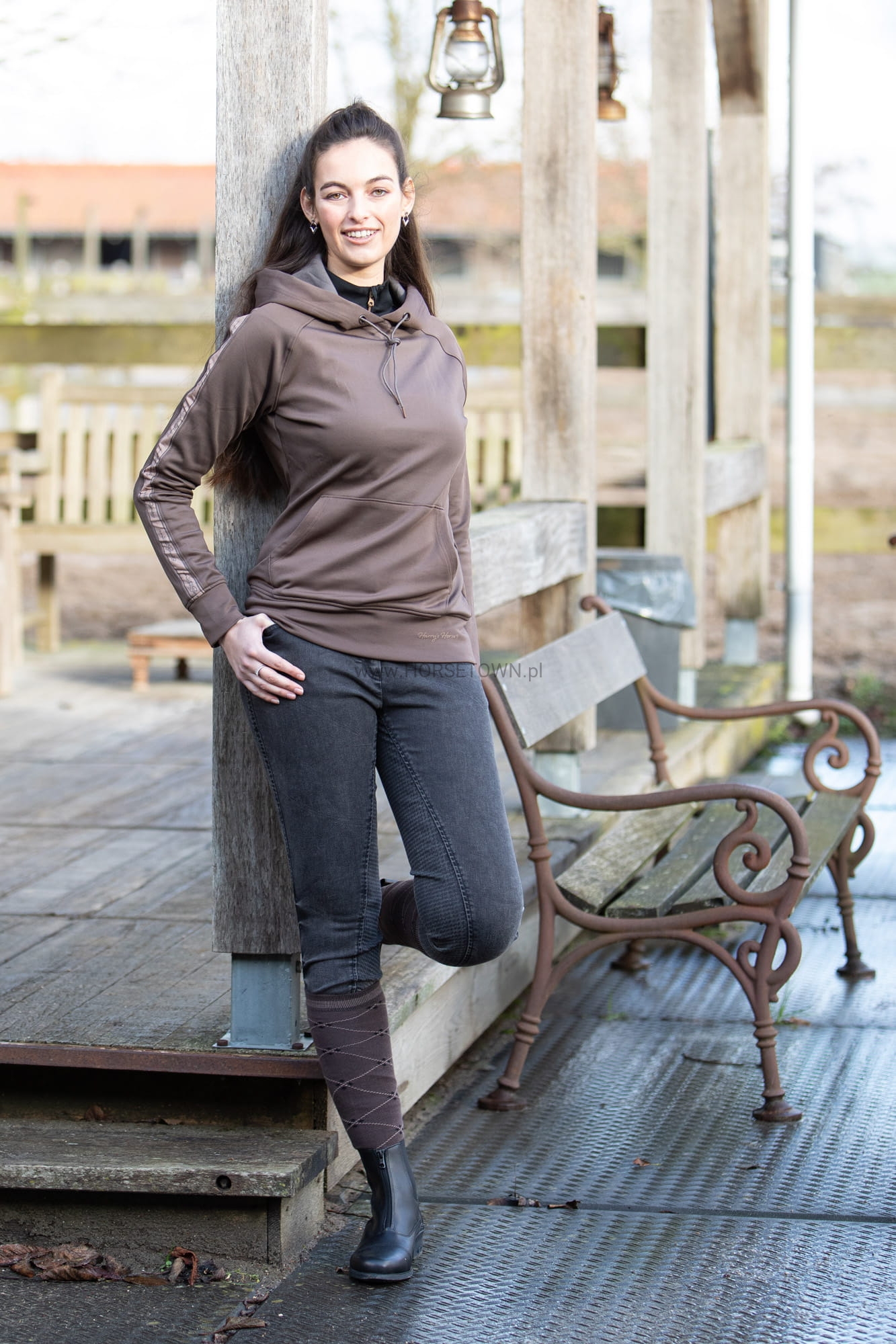 Jeansowe bryczesy jeździeckie z bocznymi i tylnymi kieszeniami, obie z metalowymi ćwiekami. Pełny silikonowy lej dla dodatkowej przyczepności w siodle, z tyłu naszywka clarino z kryształkami, elastyczne nogawki dla dodatkowego komfortu w butach jeździeckich