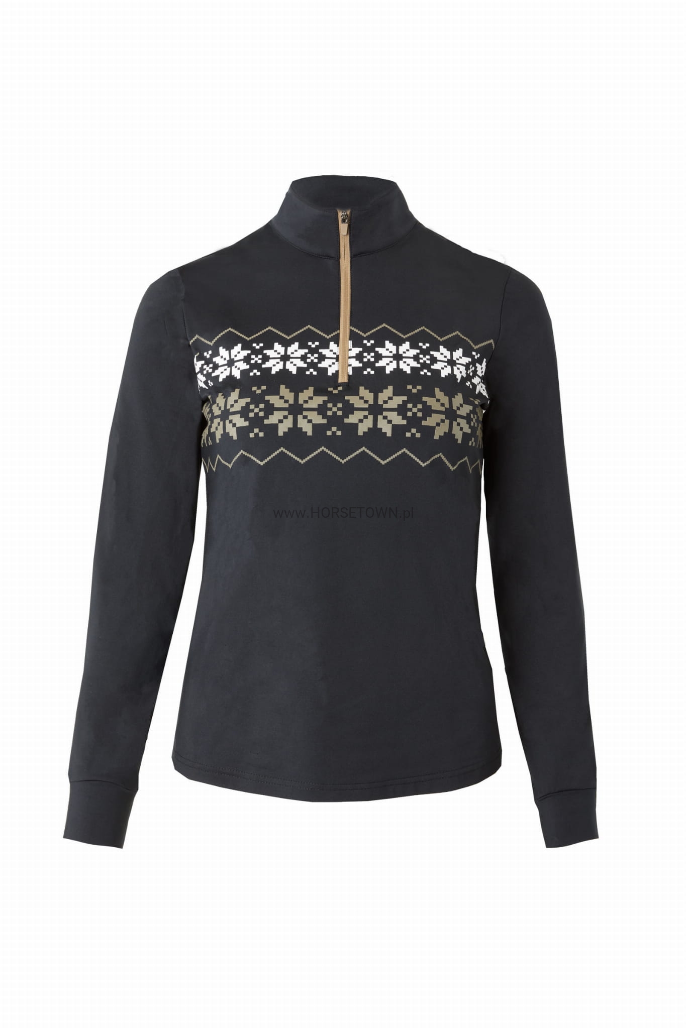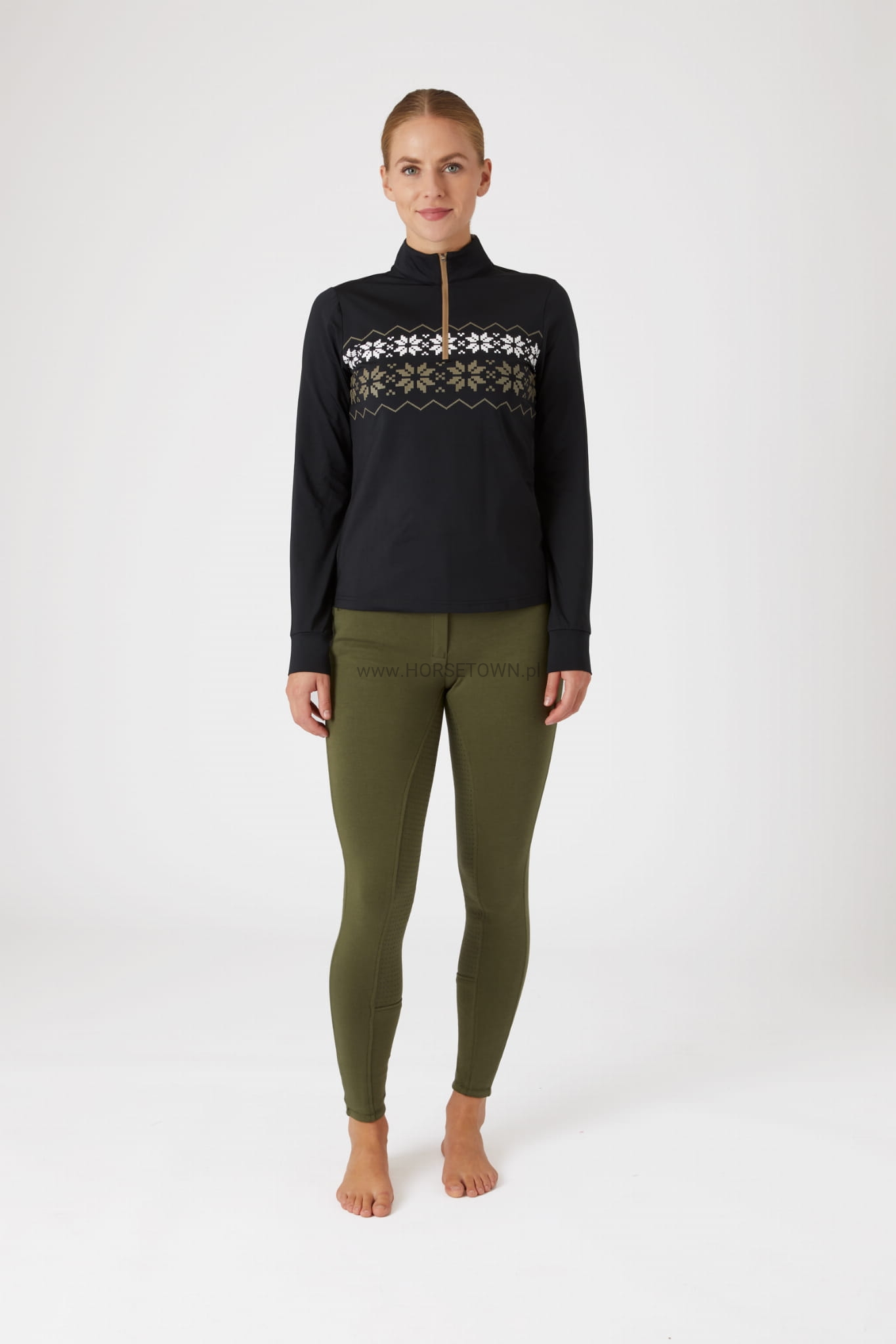 Atrakcyjny wzór w płatki śniegu będzie się komponował z pozostałymi elementami Twojej jeździeckiej garderoby na zimę.