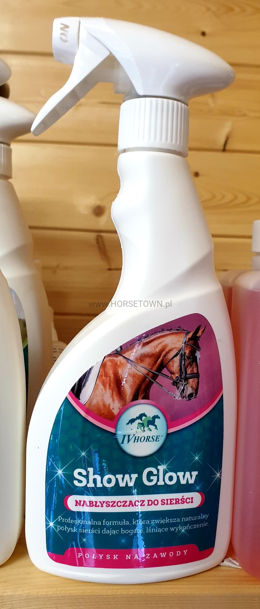 Show Glow w sprayu – spray nabłyszczający do sierści, ogona i grzywy. Zawiera unikatową mieszankę naturalnych olejów i wosków. Bardzo bogata formuła preparatu uwydatnia naturalny połysk sierści konia dając ładne, lśniące wykończenie. Idealny na zawody, daje lustrzany połysk.