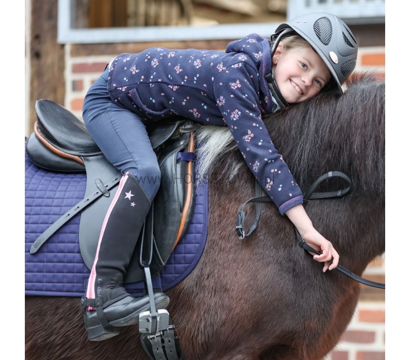 Czapsy "Lotta" oczarowują nasze końskie dziewczynki różowym zamkiem błyskawicznym, błyszczącym brokatowym paskiem i słodkim silikonowym nadrukiem w gwiazdki. Podpinki wykonane z neoprenu mają smukły krój i wysoki łuk ujeżdżeniowy. Czapsy zapinane są od góry do dołu zamkiem błyskawicznym oraz dodatkowym zatrzaskiem.