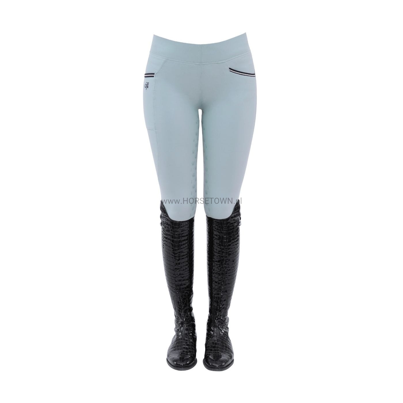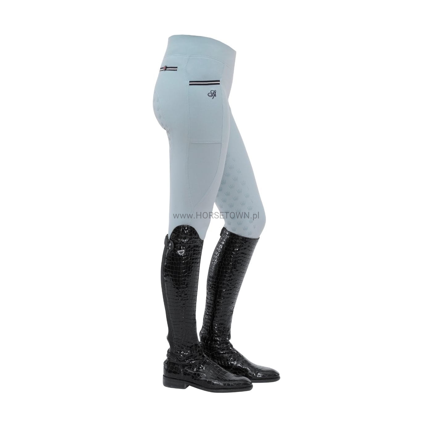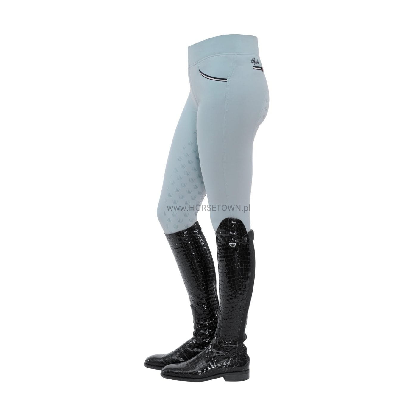 Super lekkie legginsy do jazdy konnej z bardzo szerokim pasem dla idealnego dopasowania i praktyczną kieszenią na telefon komórkowy na prawej nogawce. Kolba jest wyposażona w małe korony SPOOKS.