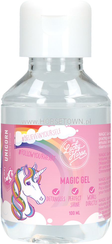 Rozprowadź niewielką ilość żelu na dłoni i wmasuj w ogon i grzywę. Pozostawić na chwilę do działania, a następnie wyczesać ogon i grzywę. Możesz także użyć Magic Gel, aby nadać ciału swojego konia lub kucyka fantastyczny połysk. Nie używać pod siodłem.