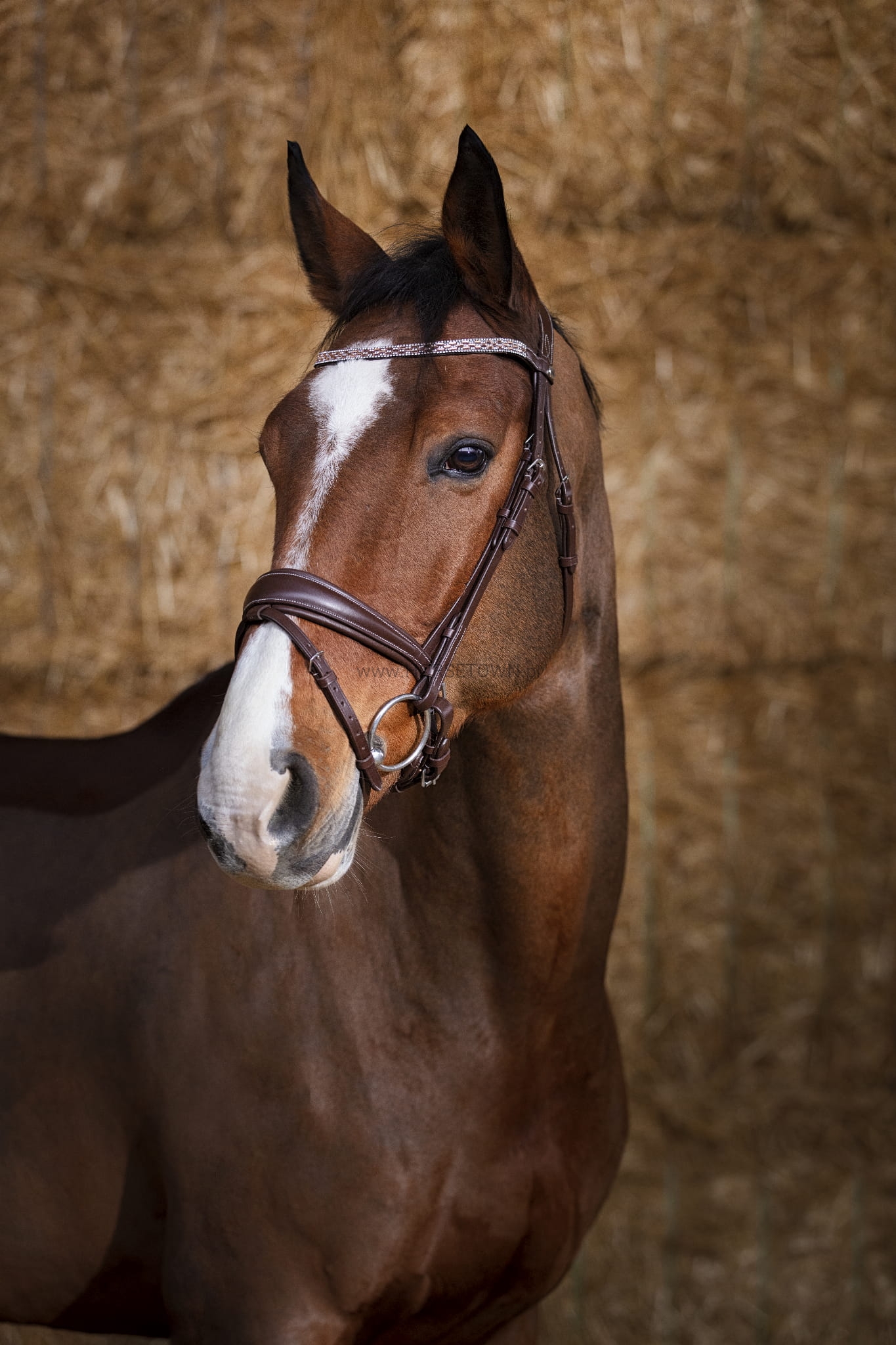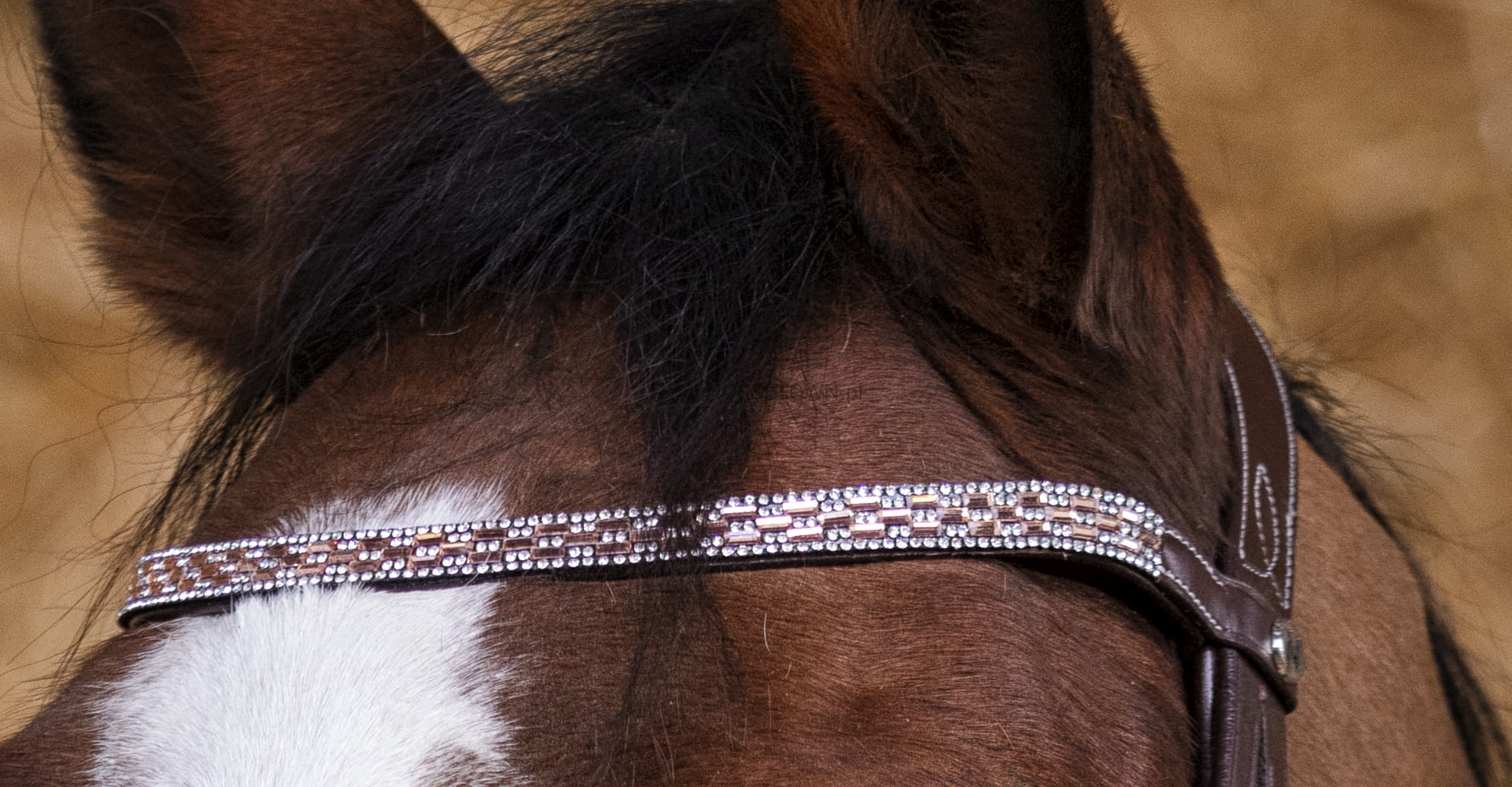 Ogłowie wykonane z najwyższej jakości skóry bawolej. Lakierowany, zdobiony brokatem nachrapnik szwedzki został obszyty miękką skórą bydlęcą. Naczółek ozdobione błyszczącymi kryształkami. Czarne ogłowie ma czarne przeszycia, a brązowe - białe. Sprzedawane BEZ wodzy.