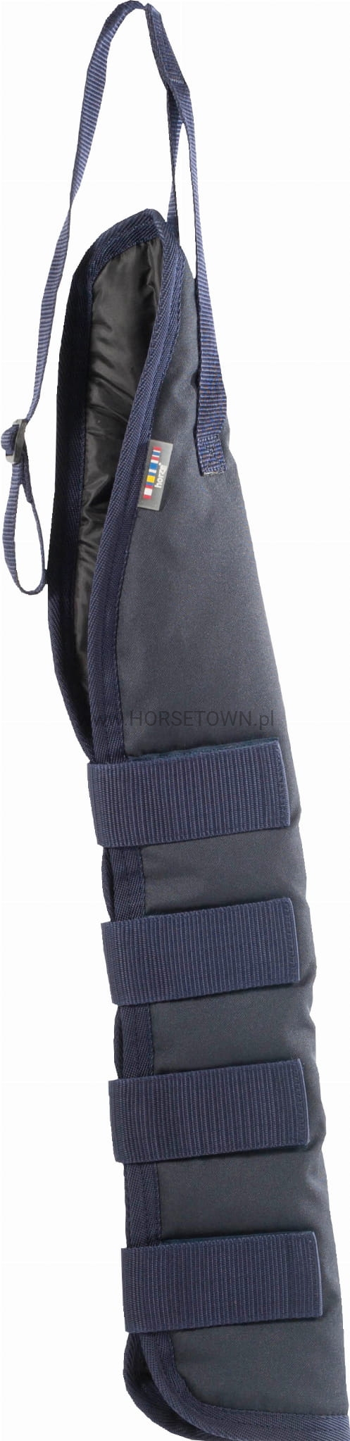 Długi, podszyty, płócienny ochraniacz chroni delikatny ogon konia przed uszkodzeniem podczas podróży, na padoku lub podczas odpoczynku w boksie. Ochraniacz posiada zapięcia na rzep.