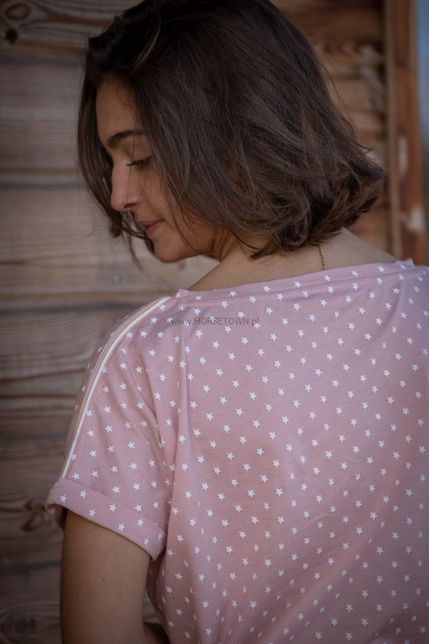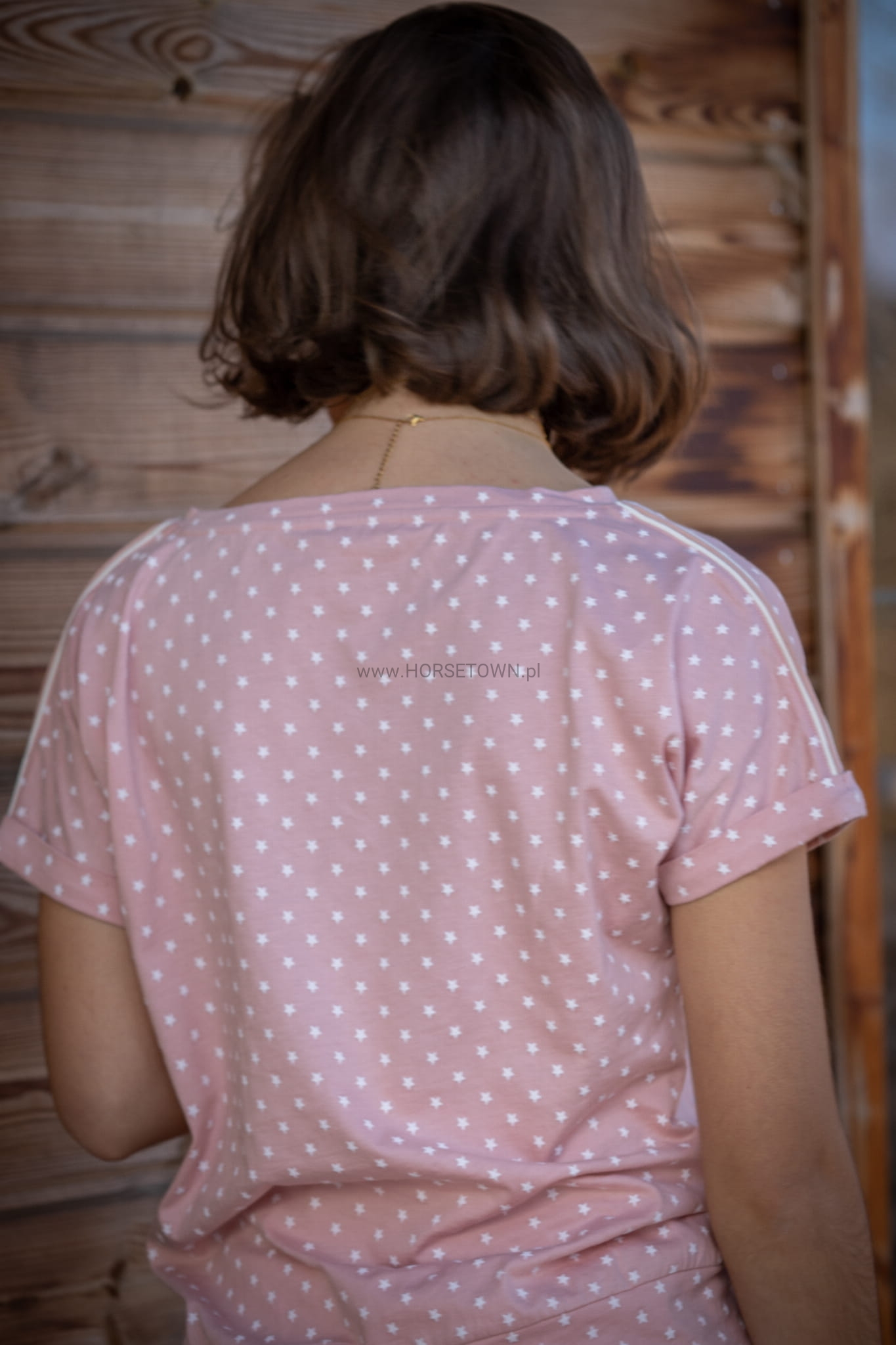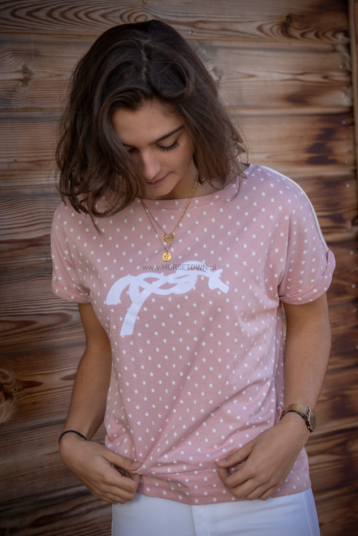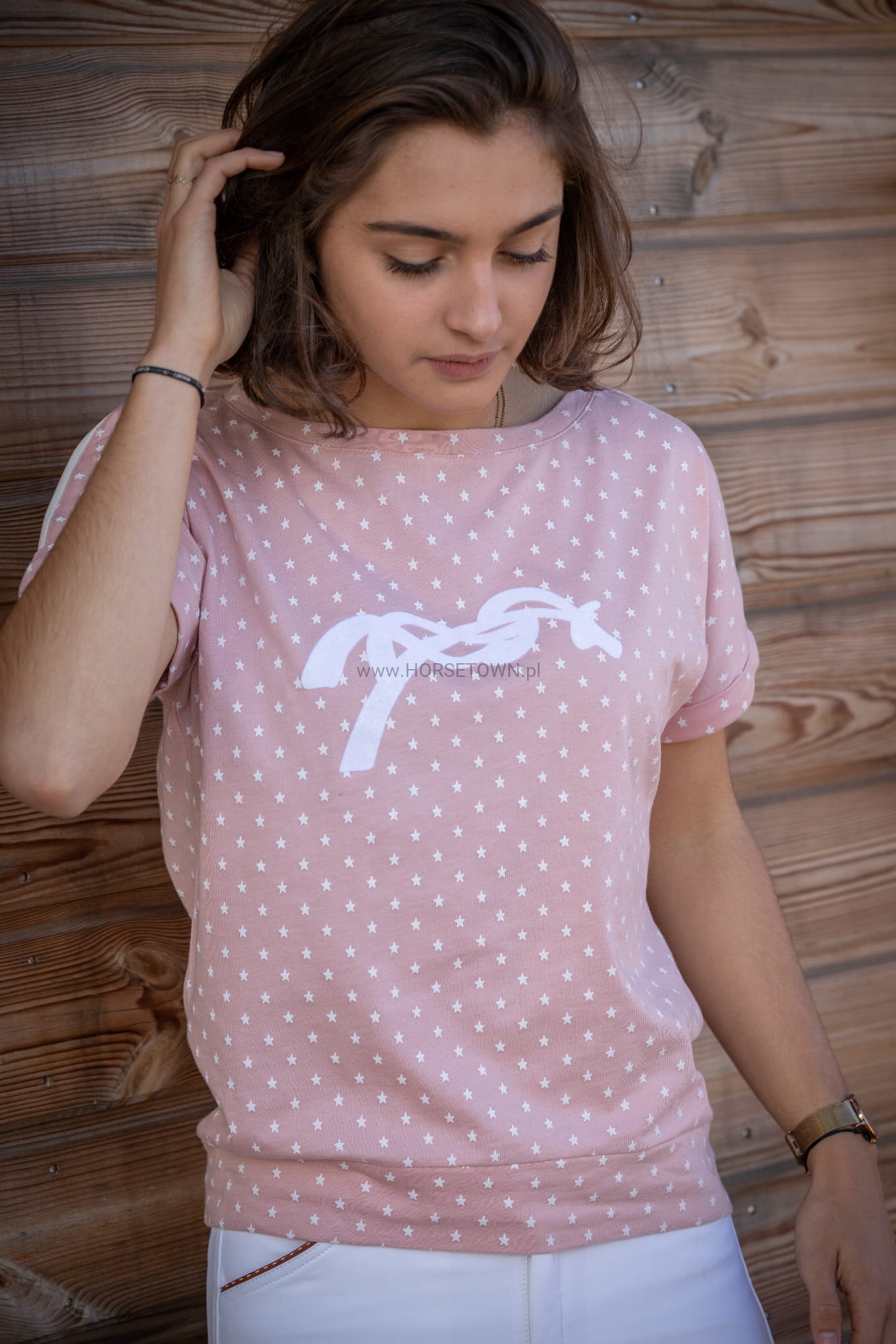 Koszulka Poppy powraca w kolekcji Wiosna/Lato 2022 i nadal ma ten fason, który wszyscy kochamy: nie za luźny, nie za dopasowany, będzie pasował do każdego typu sylwetki! Uszyta z różowego materiału w białe gwiazdki, ma krótkie rękawy bez żadnych szwów. Na ramionach i rękawach cienka biała lamówka. Z przodu logo Pénélope jest z białego aksamitu, dopasowane do lamówki na ramionach. Do noszenia na dżinsach lub bryczesach będzie świetnie wyglądać na obu.