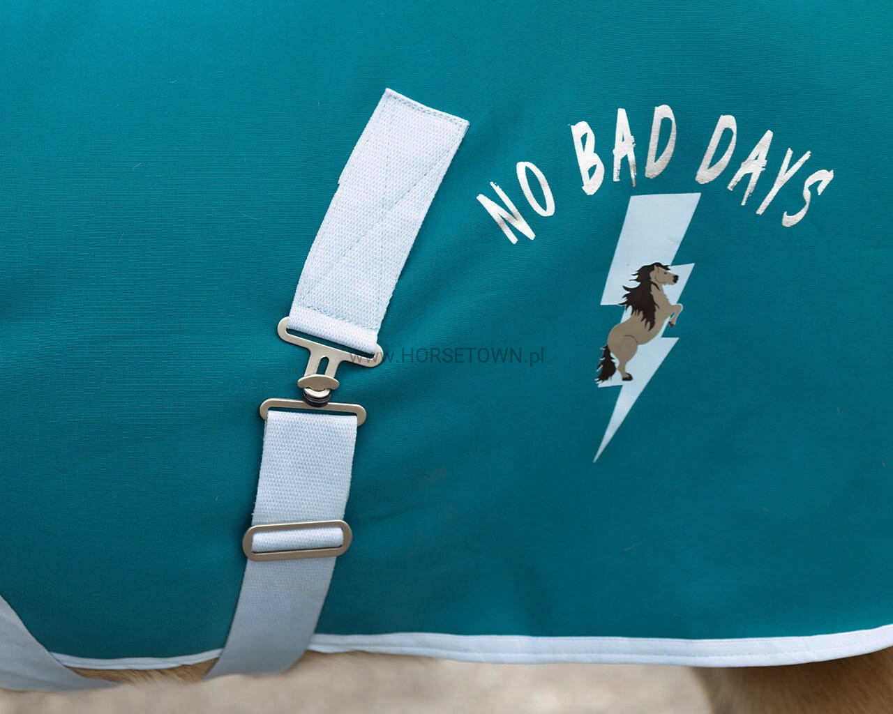 Wow! Ta derka ma piękny kołnierz z imitacji wełny i detale w postaci uderzenia pioruna, takie jak napis „No bad days” na boku derki. Na derce znajduje się również ilustracja przedstawiająca uderzenie pioruna. Ty też chcesz trenować w krzykliwym stroju, prawda?