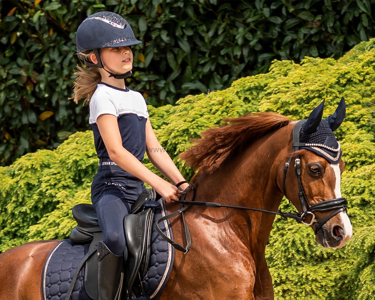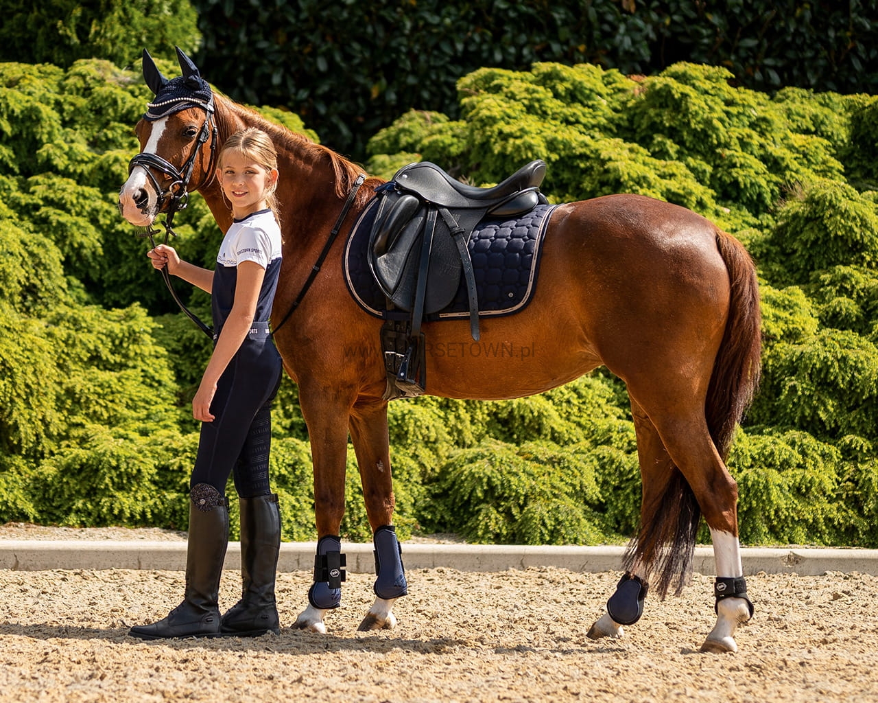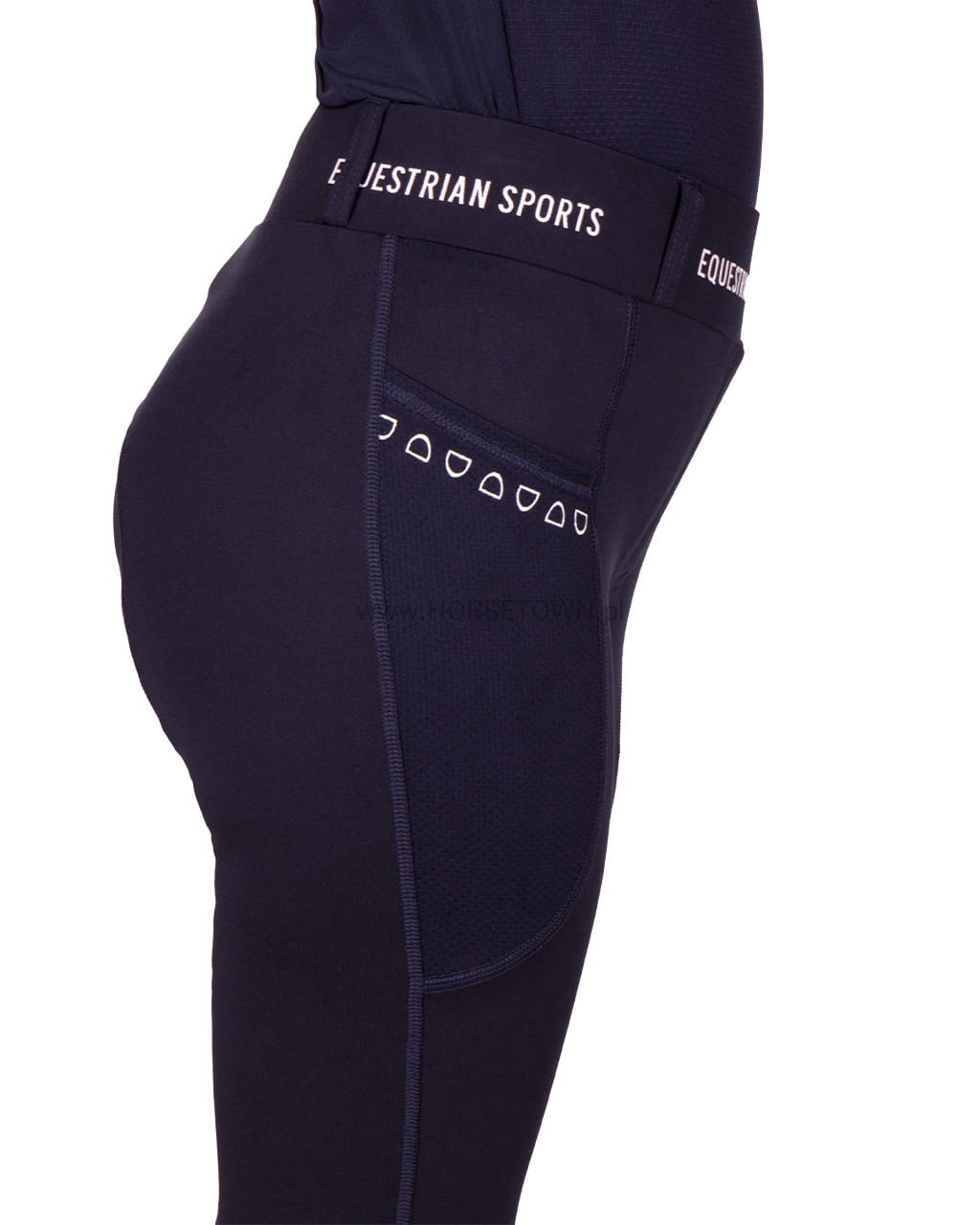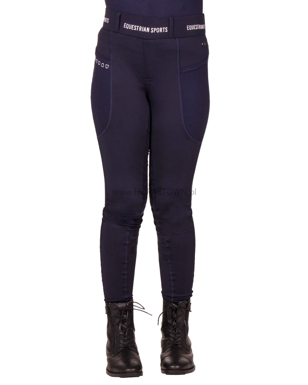 Postaw na wygodę tego lata! Jady to wygodne legginsy jeździeckie o doskonałym kroju. Te rajstopy są wykonane z elastycznego, rozciągliwego w 4 kierunkach materiału i nadają się do noszenia przez cały rok. Sportowy wygląd dopełnia pasek w połączeniu z napisem „Equestrian Sports”.