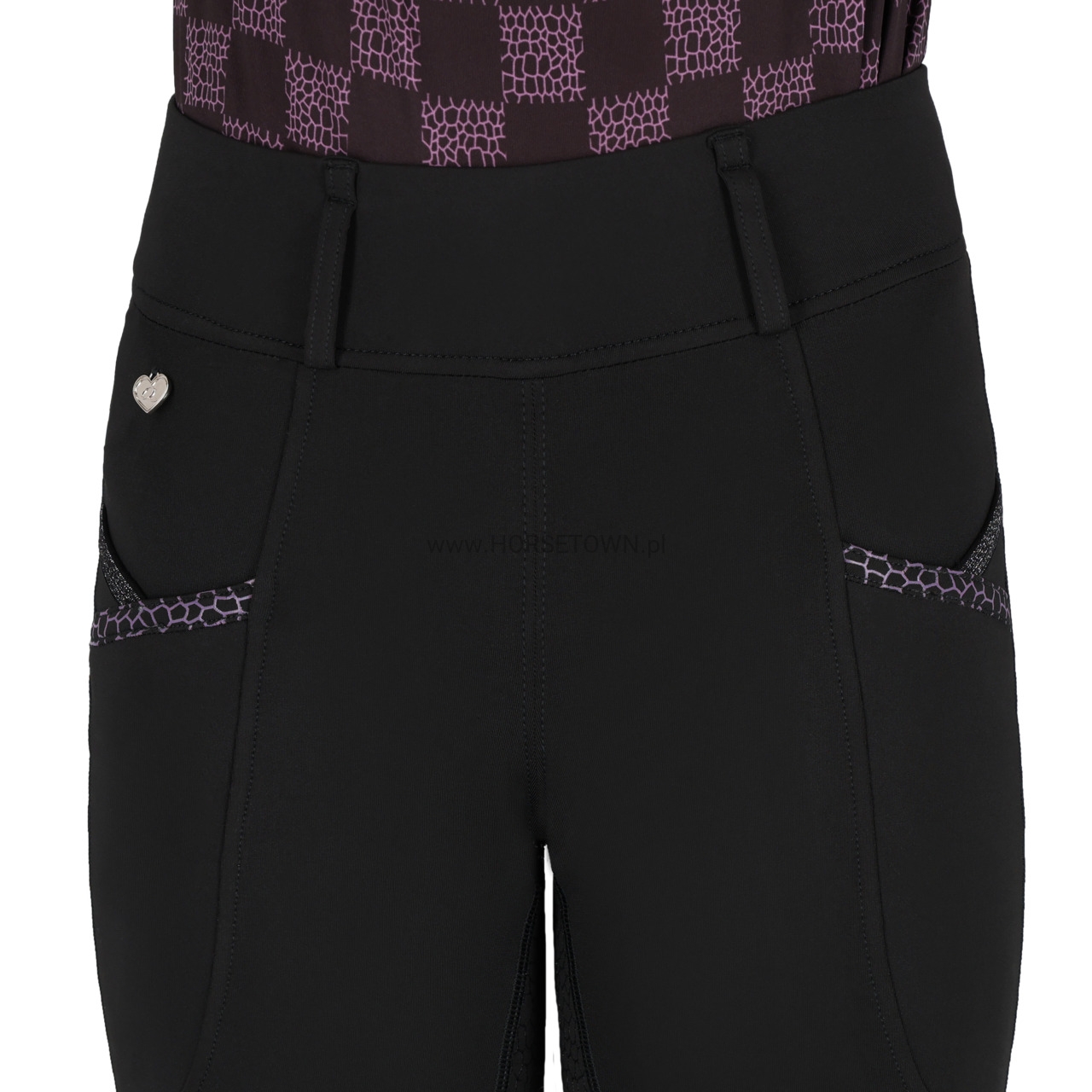 Legginsy zostały wyposażone w pełny lej o średniej przyczepności z subtelnym wzorem, a praktyczne kieszenie boczne zdobi błyszcząca lamówka z brokatem. Z tyłu znajdują się dekoracyjne kieszonki z eleganckim obszyciem, a całość dopełnia urocza przypinka Q w kształcie serduszka.