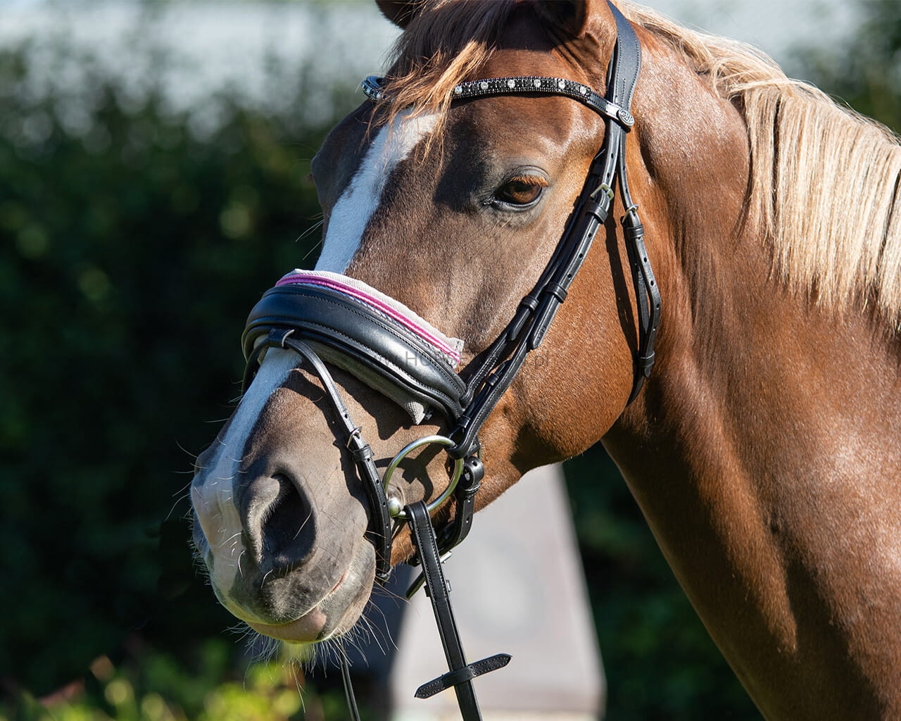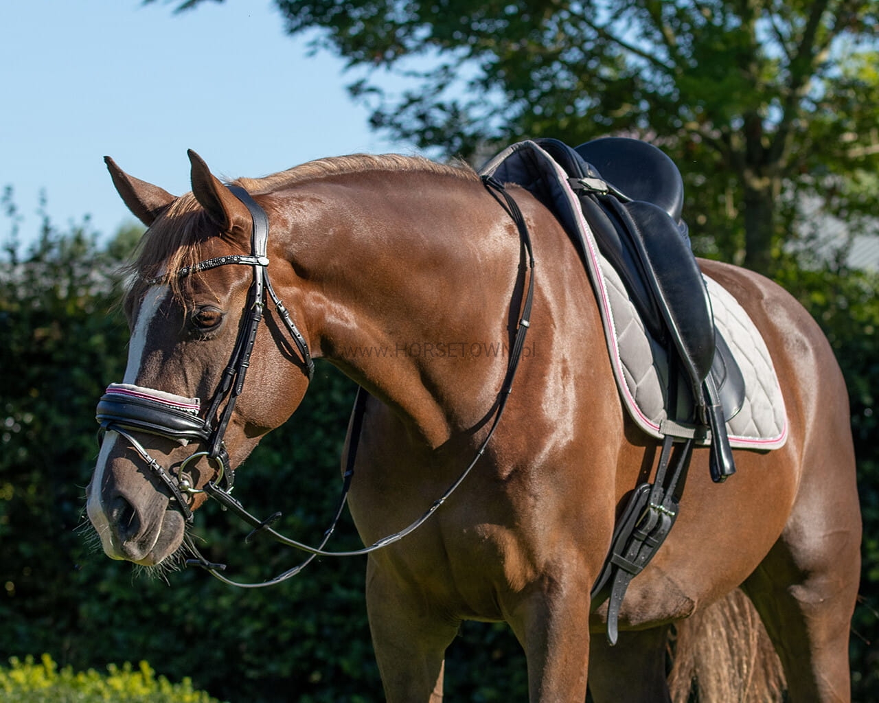 Zmień swoją uzdę w naprawdę przyciągającą wzrok. Ta aksamitna podkładka z falistym wzorem jest ozdobiona dwoma błyszczącymi sznurkami nad nachrapnikiem. Wkładka może być umieszczona na czubku nosa pod nachrapnikiem i zapobiega podrażnieniom, odparzeniom i uciskom. Wkładka jest podszyta chłonną tkaniną.