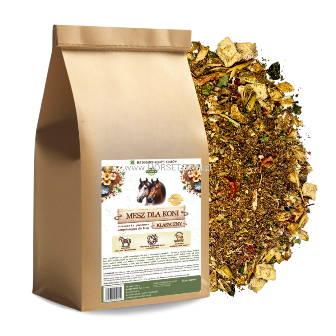 Mesz Tradycyjny nie zawiera melasy, soi ani sztucznych dodatków. Został stworzony z myślą o wszystkich koniach – od sportowych, przez źrebne klacze, aż po konie starsze czy te mające trudności z przybieraniem na masie. Wysoka zawartość białka i tłuszczu sprawia, że stanowi on doskonałe wsparcie w codziennej diecie, zwłaszcza w okresach większego zapotrzebowania energetycznego lub rekonwalescencji.
