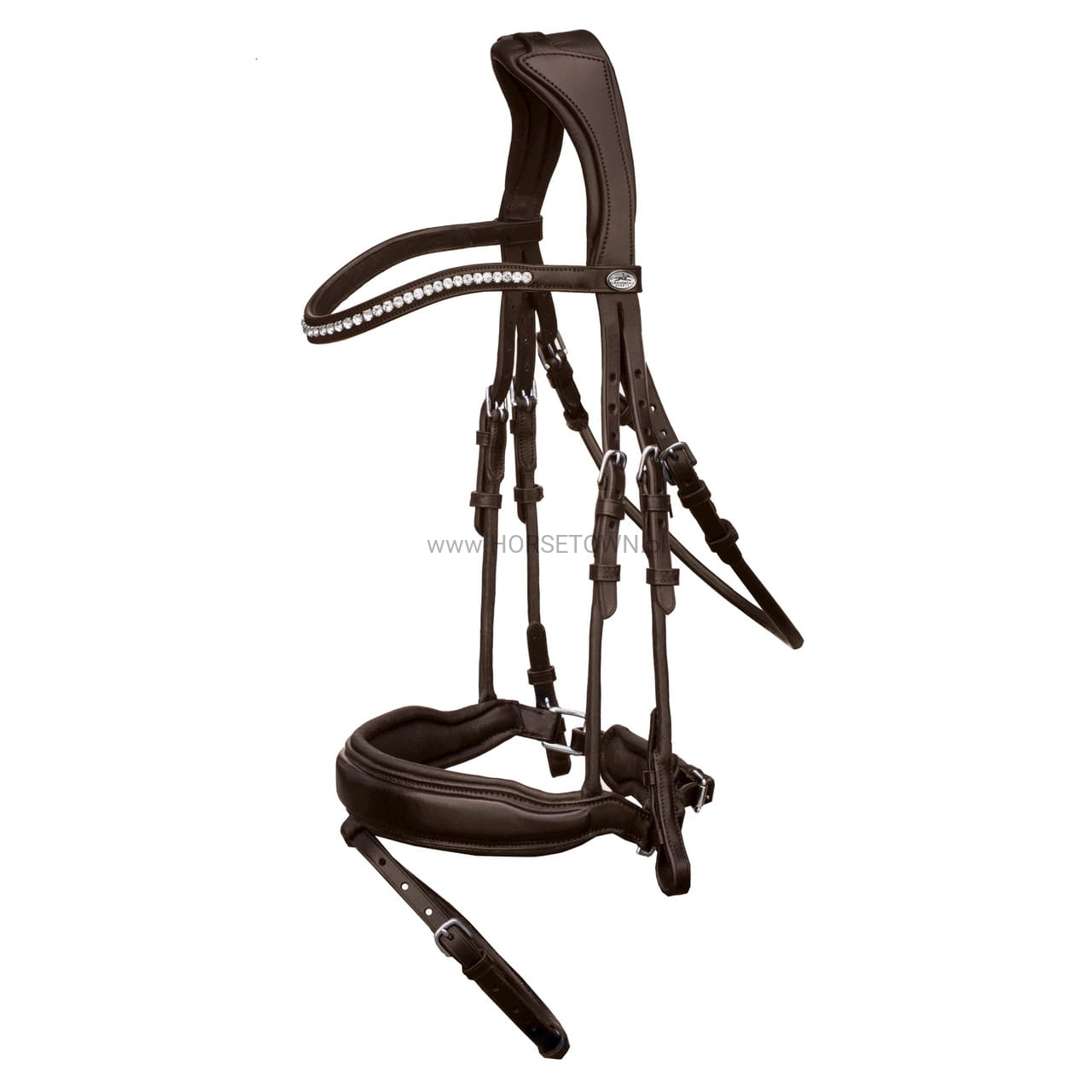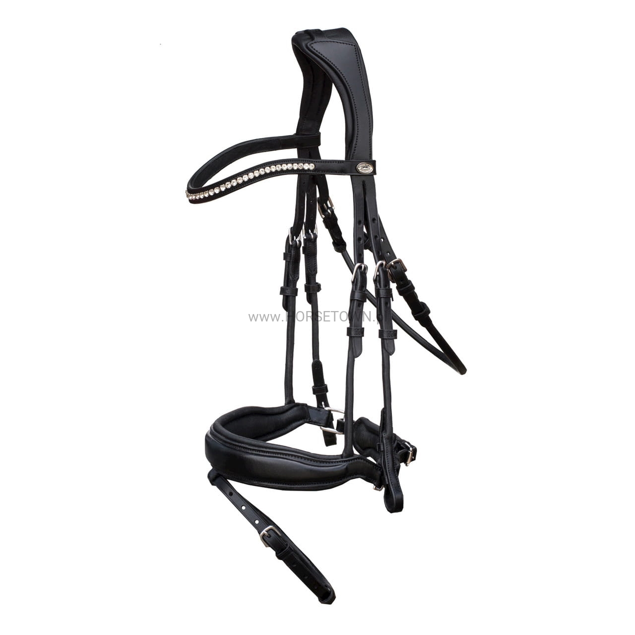 Ogłowie dresażowe, anatomicznie wyprofilowane, posiada anatomicznie wyprofilowany nachrapnik oraz potylicę