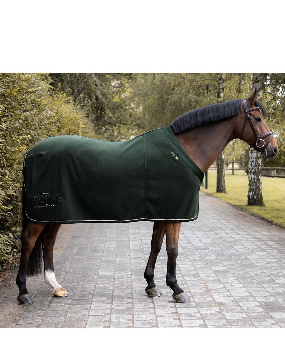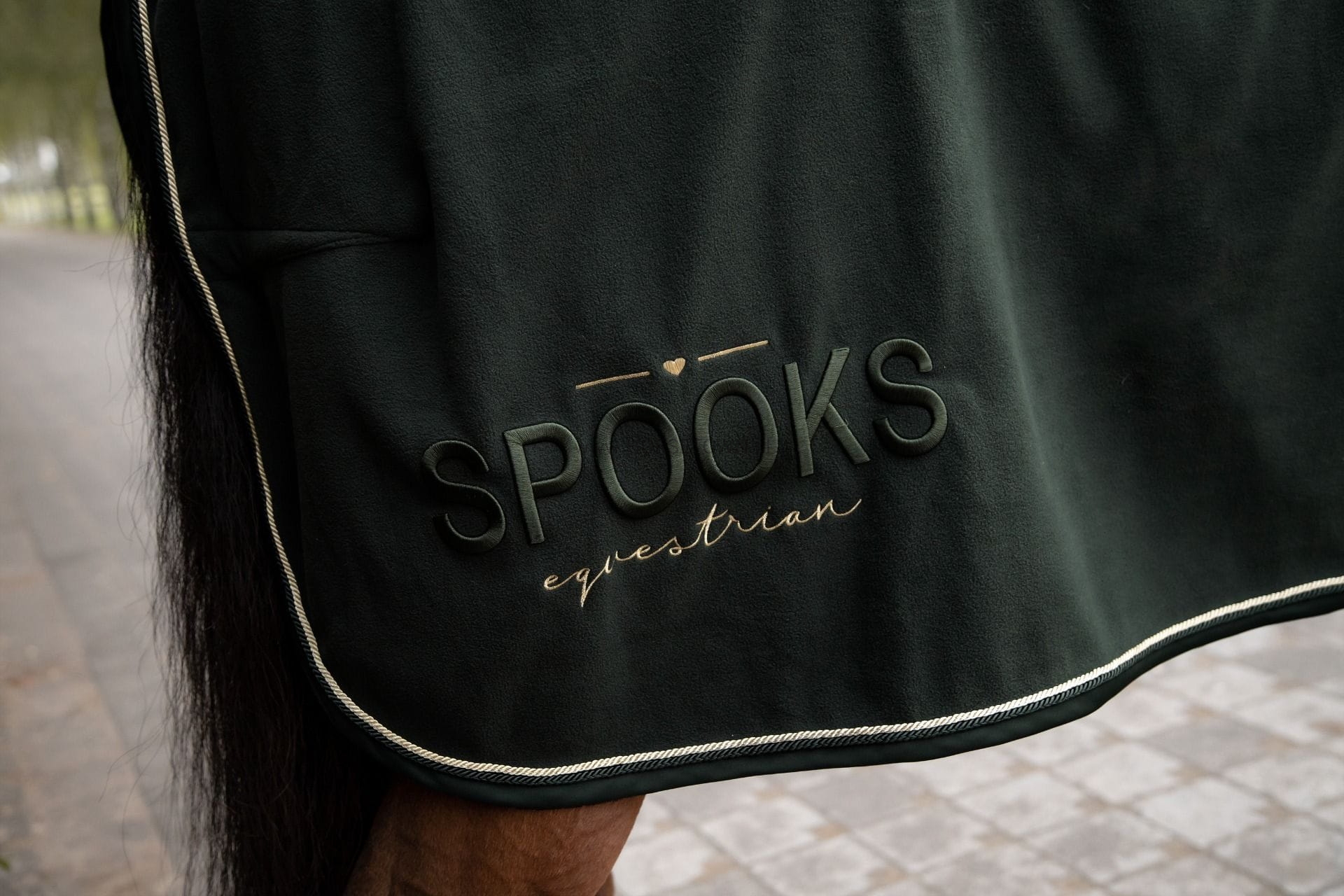 Derka Annber wyróżnia się szlachetnym haftem SPOOKS ze złotymi detalami po obu stronach. Projekt derki dresowej dopełnia lamówka wykonana z błyszczącej tkaniny wierzchniej z tonowanym tonem i złotym ozdobnym sznurkiem. Koc dresowy wykonany jest z wysokiej jakości materiału polarowego. Zapięcie z przodu w kształcie litery T i odpinany pasek na ogon zapewniają, że derka pozostaje na swoim miejscu na koniu. Koc idealnie nadaje się do transportu po treningu lub do zabezpieczenia sprzętu na turnieju.