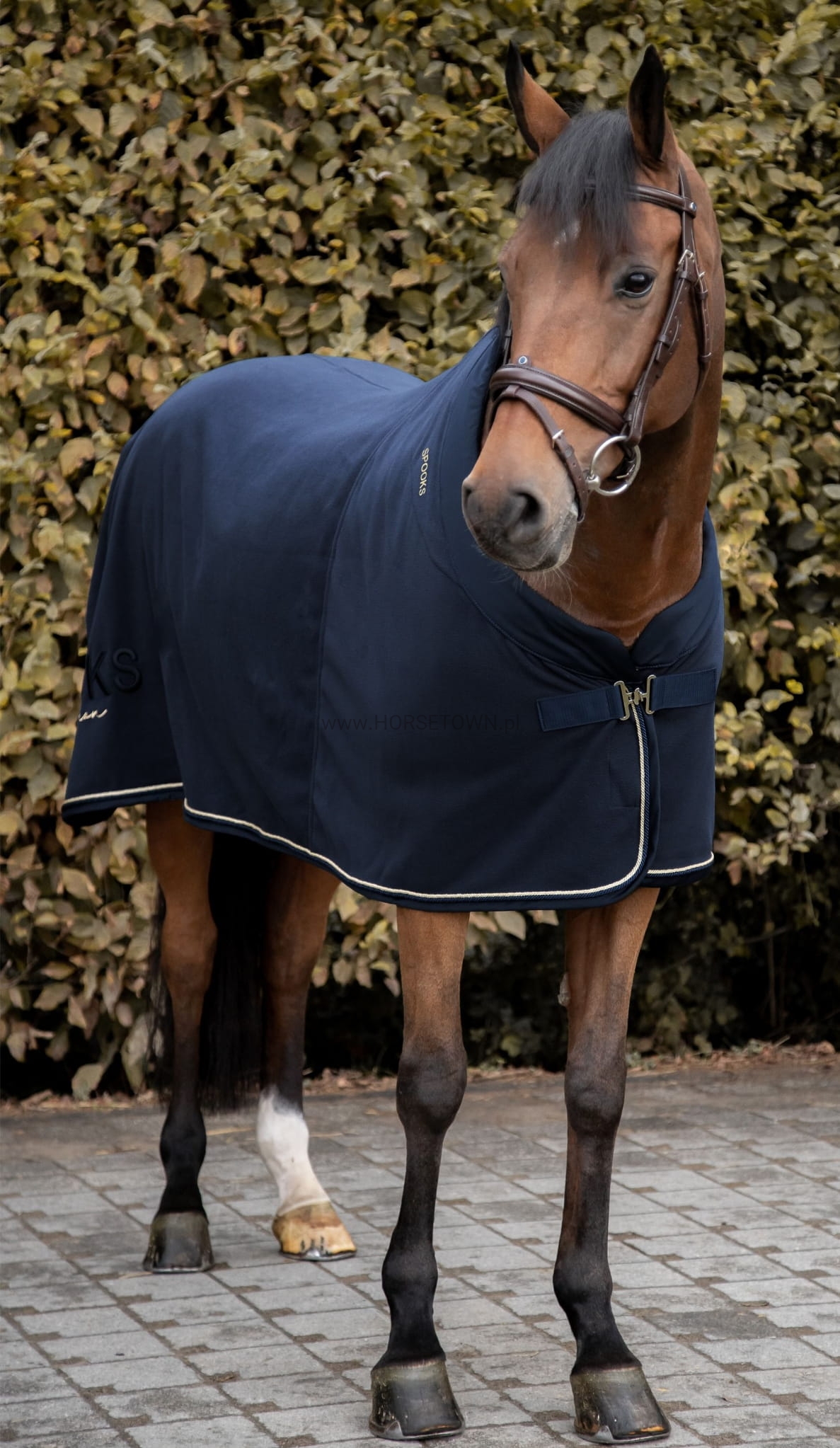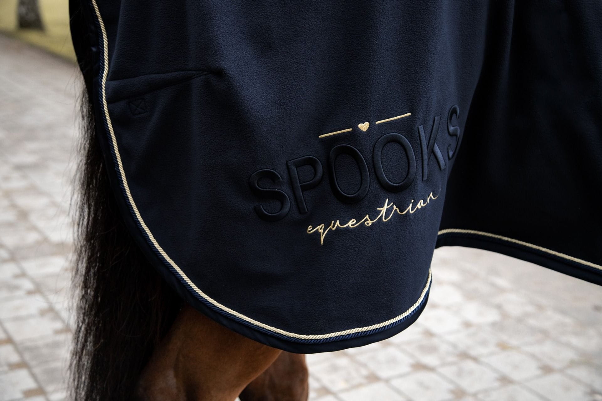 Derka Annber wyróżnia się szlachetnym haftem SPOOKS ze złotymi detalami po obu stronach. Projekt derki dresowej dopełnia lamówka wykonana z błyszczącej tkaniny wierzchniej z tonowanym tonem i złotym ozdobnym sznurkiem. Koc dresowy wykonany jest z wysokiej jakości materiału polarowego. Zapięcie z przodu w kształcie litery T i odpinany pasek na ogon zapewniają, że derka pozostaje na swoim miejscu na koniu. Koc idealnie nadaje się do transportu po treningu lub do zabezpieczenia sprzętu na turnieju.