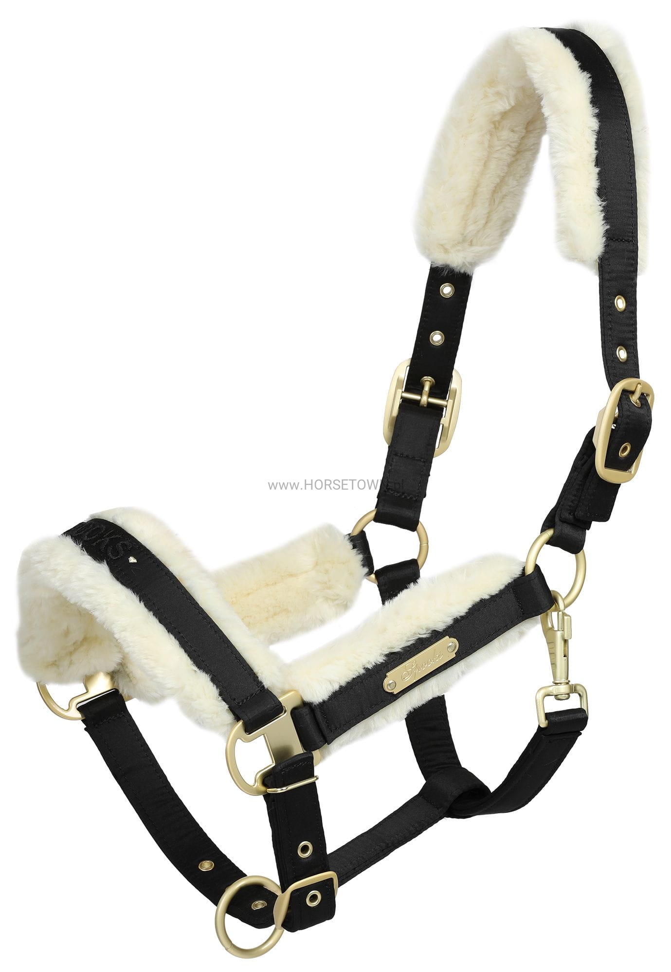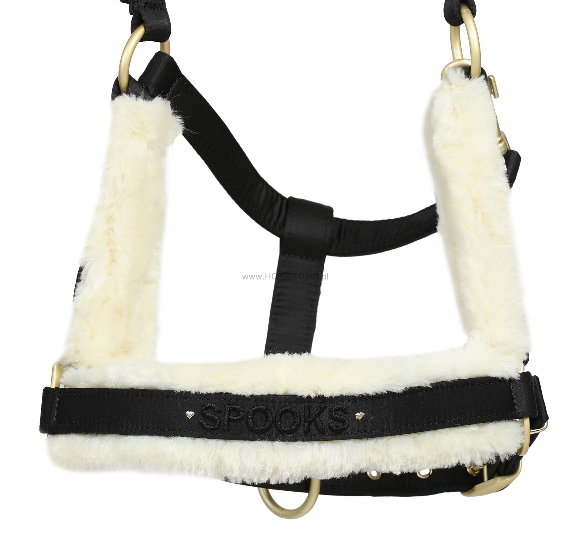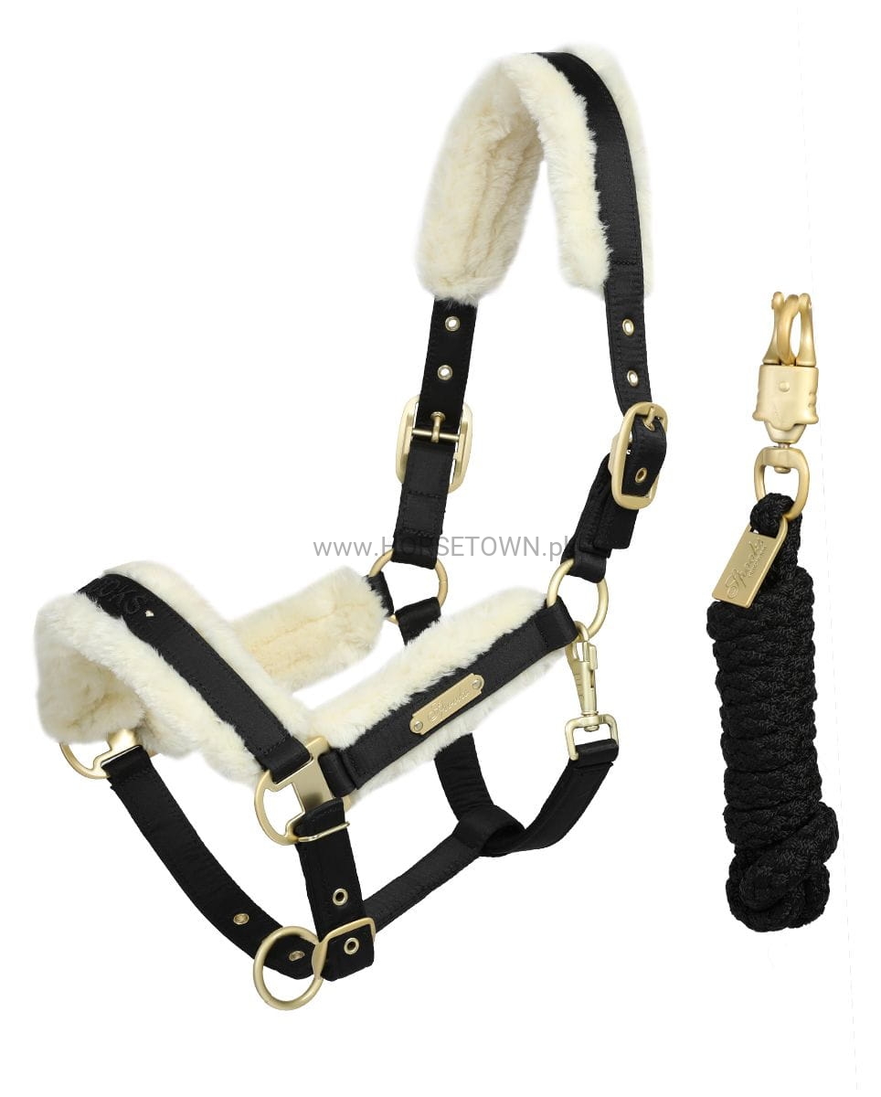 Elegancki kantar z miękką wyściółką ze sztucznego futra na nachrapniku, policzku i nakryciu głowy. Odpinane sztuczne futerko pozwala na oddzielne pranie. Okucia i plakietka z logo SPOOKS są w kolorze matowego złota, aby pasowały do dołączonej liny prowadzącej.
