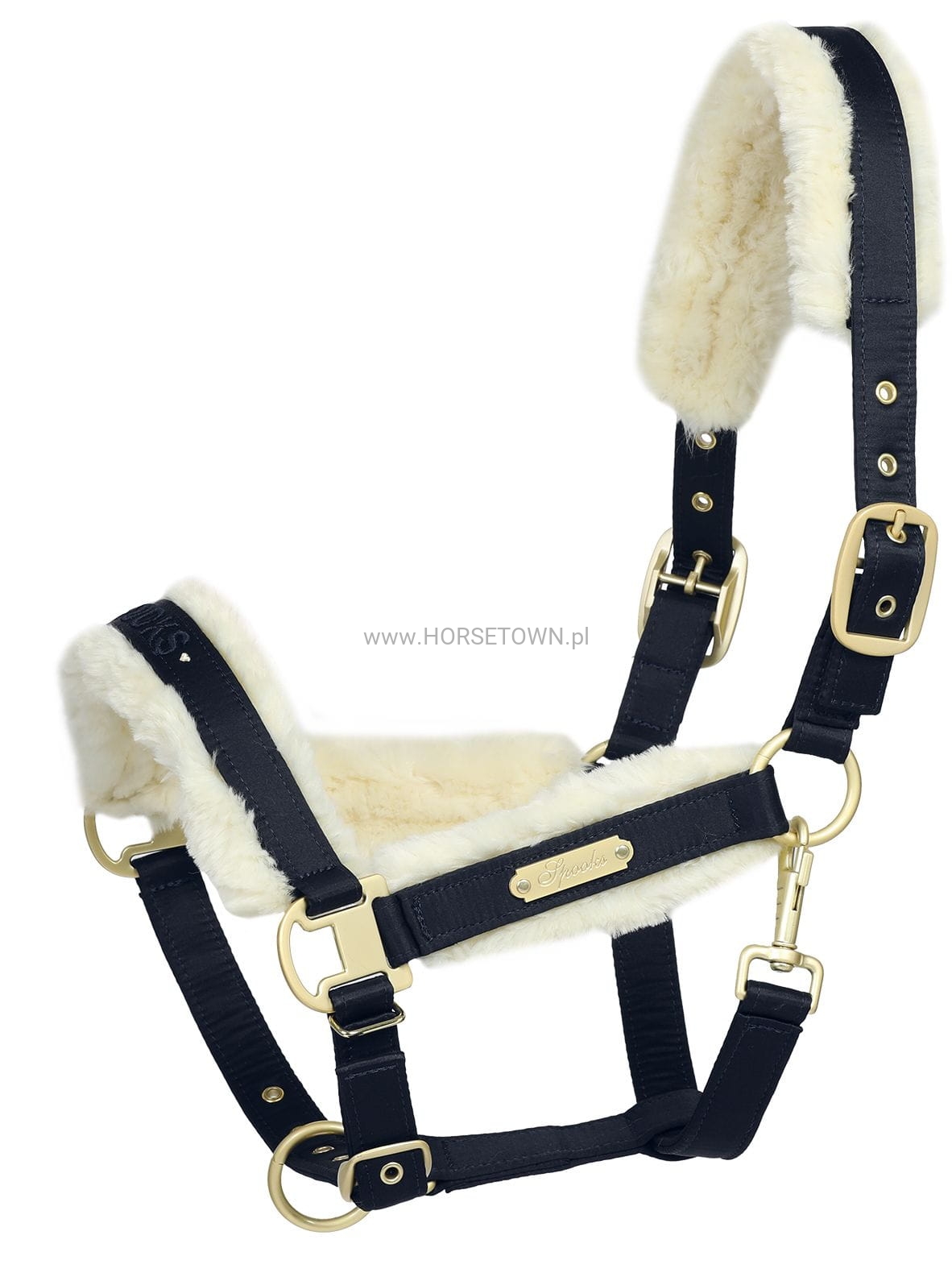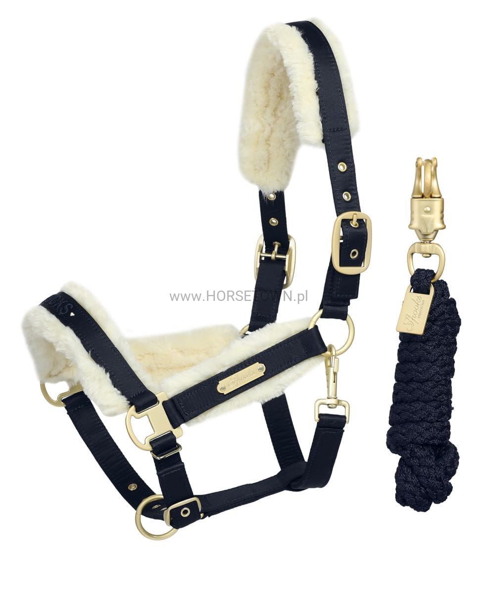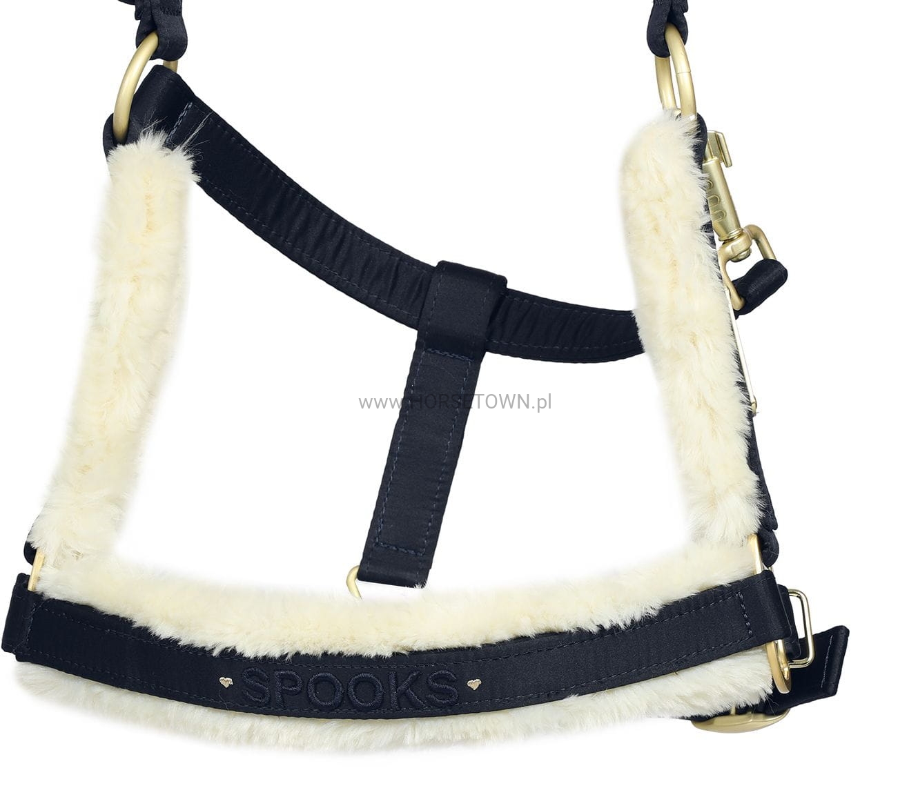 Elegancki kantar z miękką wyściółką ze sztucznego futra na nachrapniku, policzku i nakryciu głowy. Odpinane sztuczne futerko pozwala na oddzielne pranie. Okucia i plakietka z logo SPOOKS są w kolorze matowego złota, aby pasowały do dołączonej liny prowadzącej.