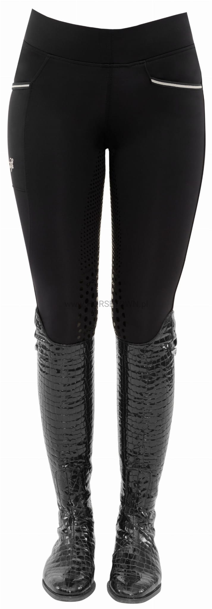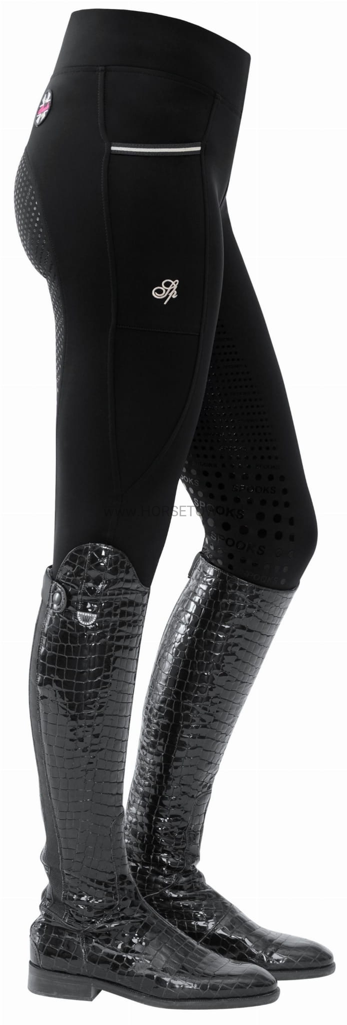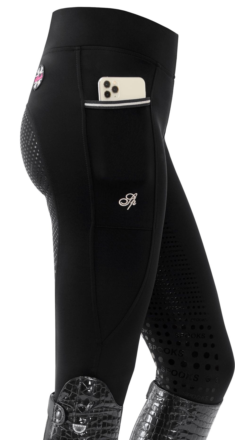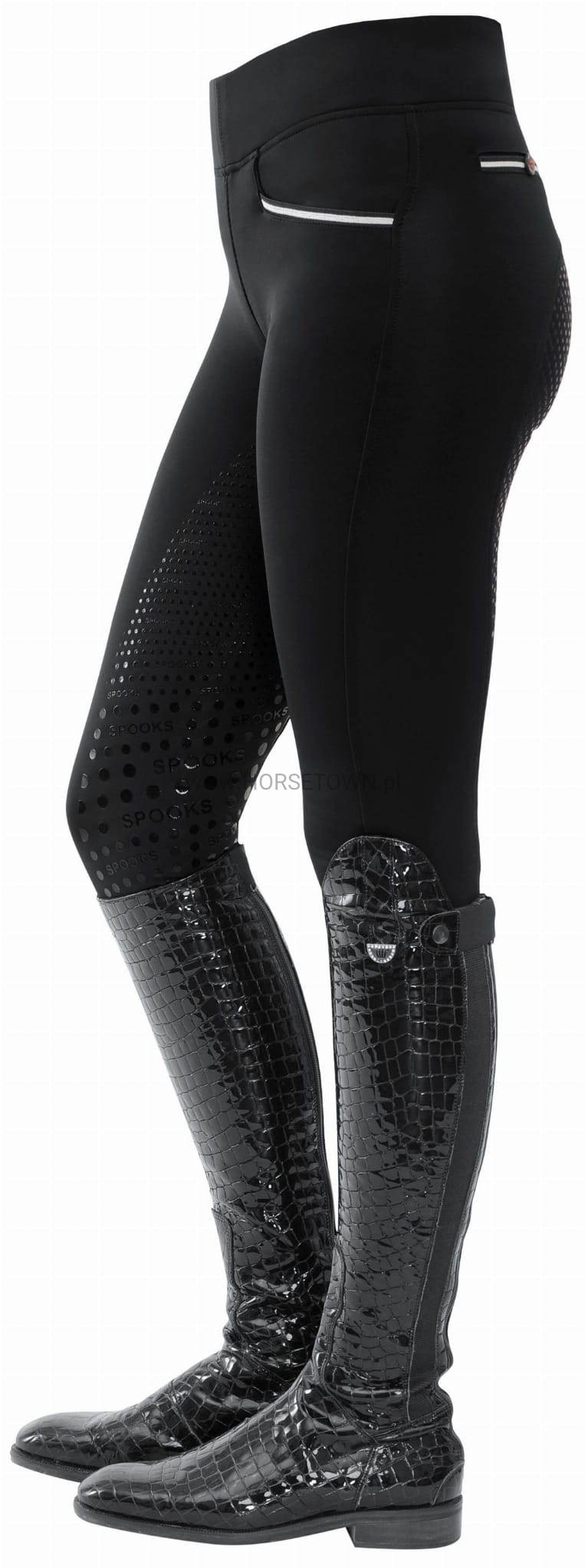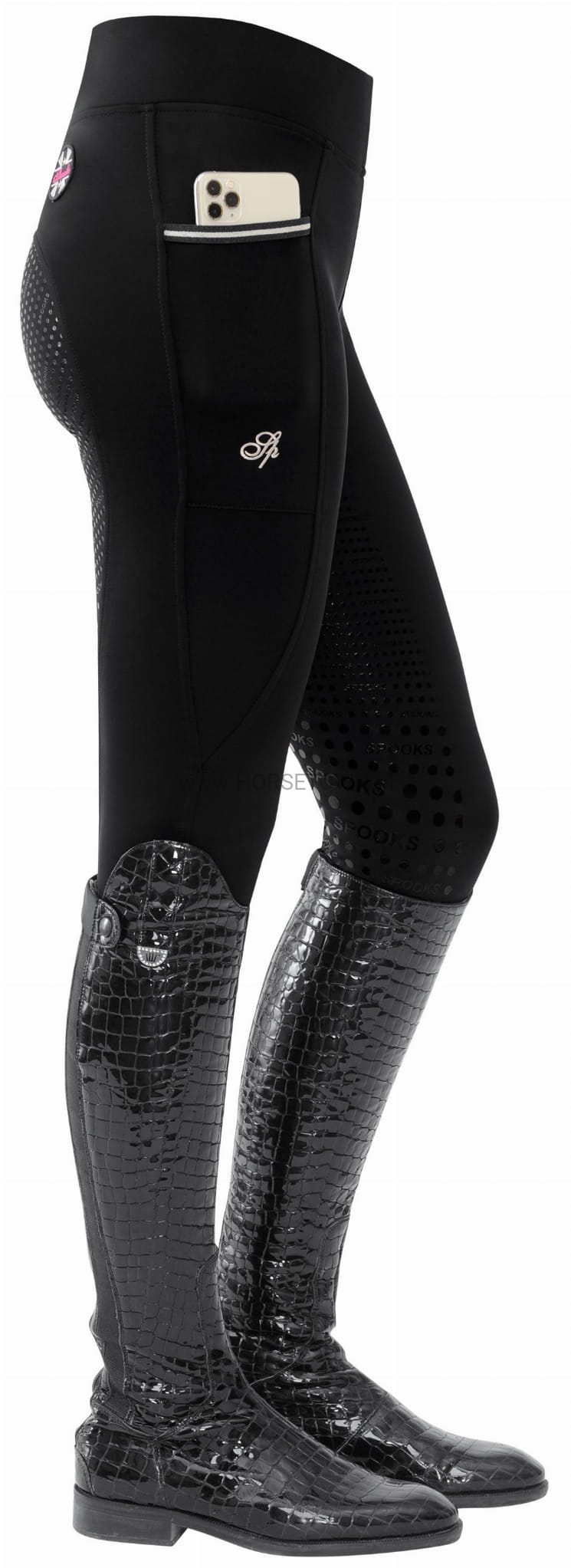 Ciepłe ocieplane legginsy z bardzo szerokim pasem dla idealnego dopasowania. Bryczesy posiadają wiele detali, takich jak naszywka z logo SPOOKS i napis SPOOKS z tyłu, a także kieszeń na telefon komórkowy z eleganckim haftem.