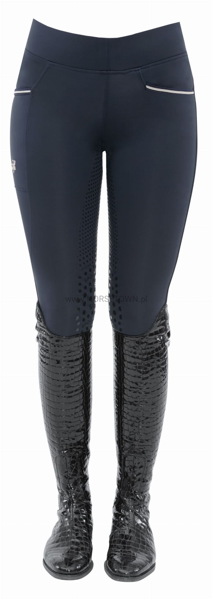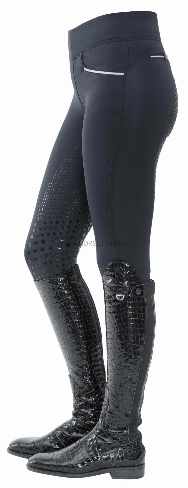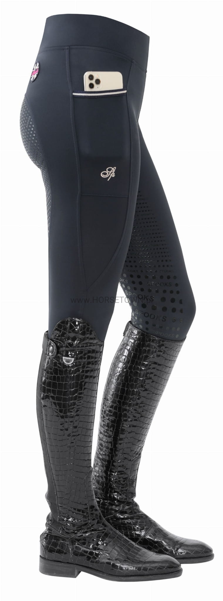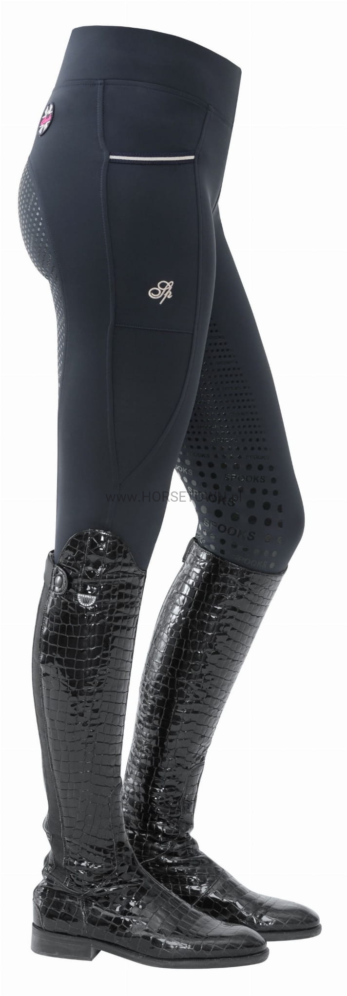 Ciepłe ocieplane legginsy z bardzo szerokim pasem dla idealnego dopasowania. Bryczesy posiadają wiele detali, takich jak naszywka z logo SPOOKS i napis SPOOKS z tyłu, a także kieszeń na telefon komórkowy z eleganckim haftem.