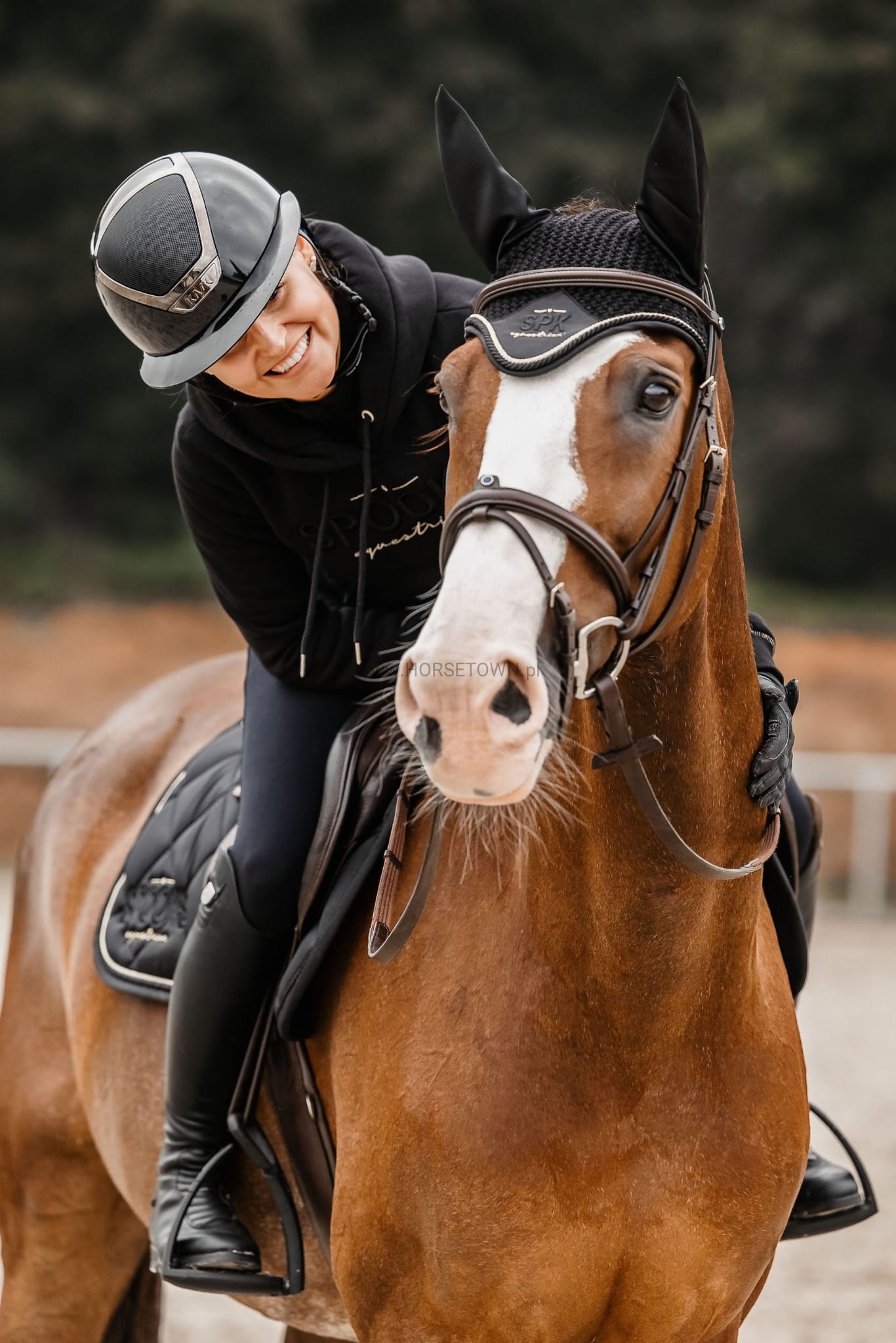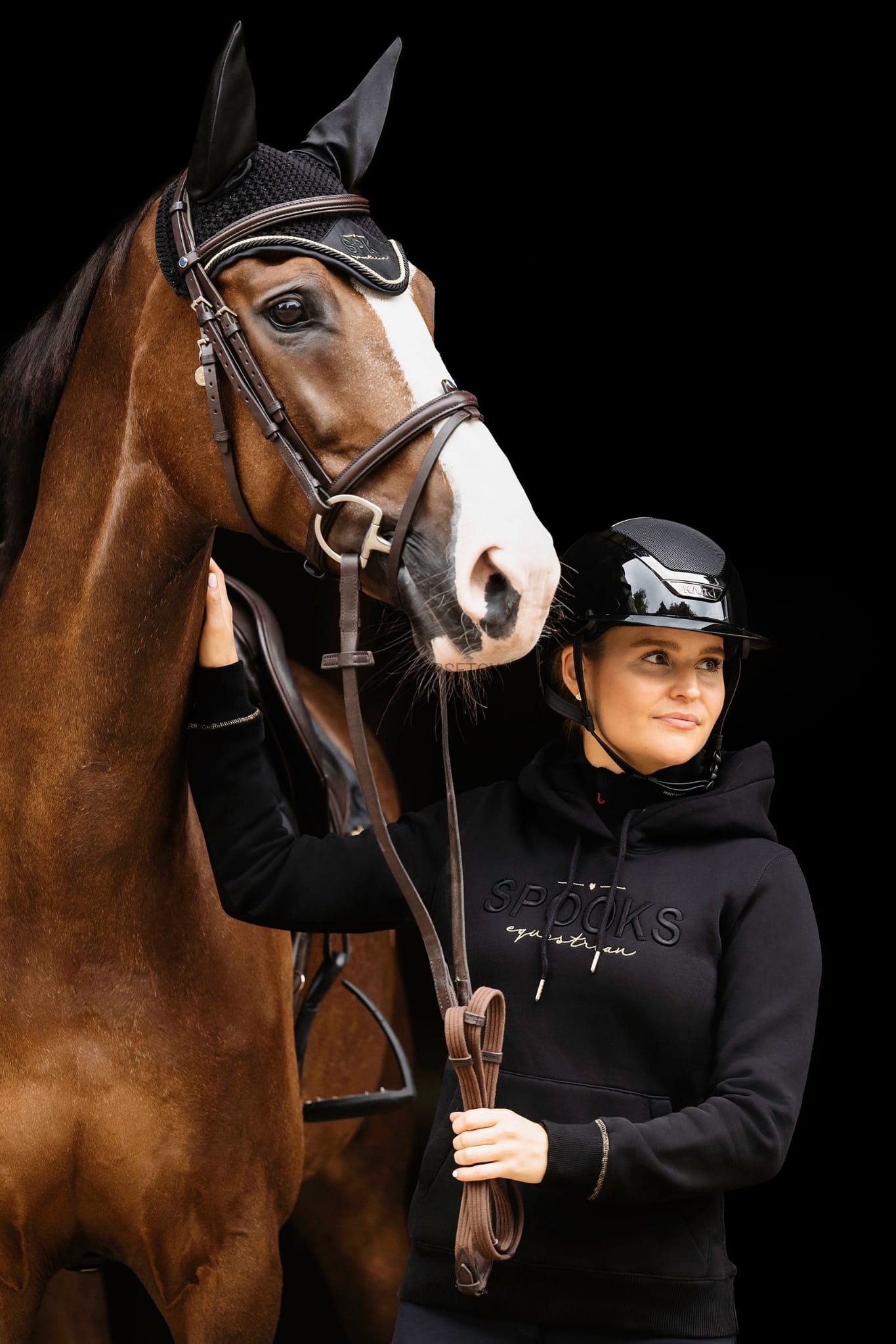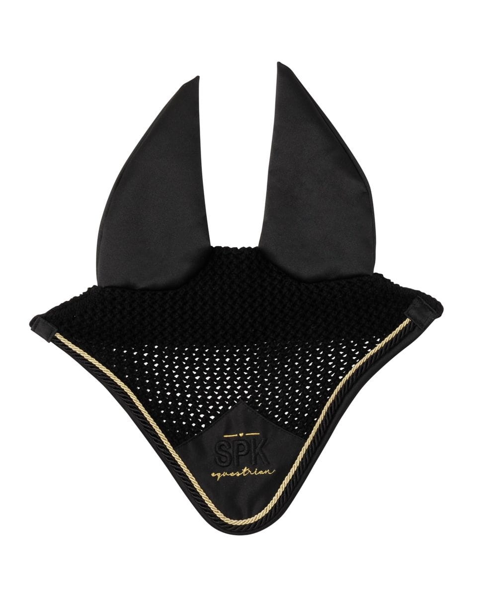 Nauszniki z dwoma ozdobnymi sznurkami i błyszczącym materiałem wierzchnim. Artystyczny projekt dopełnia misternie wyszywane logo SPOOKS ze złotymi detalami z przodu. Drobno oczkowa tkanina uszu nie tylko wygląda szykownie, ale także odstrasza najmniejsze owady.