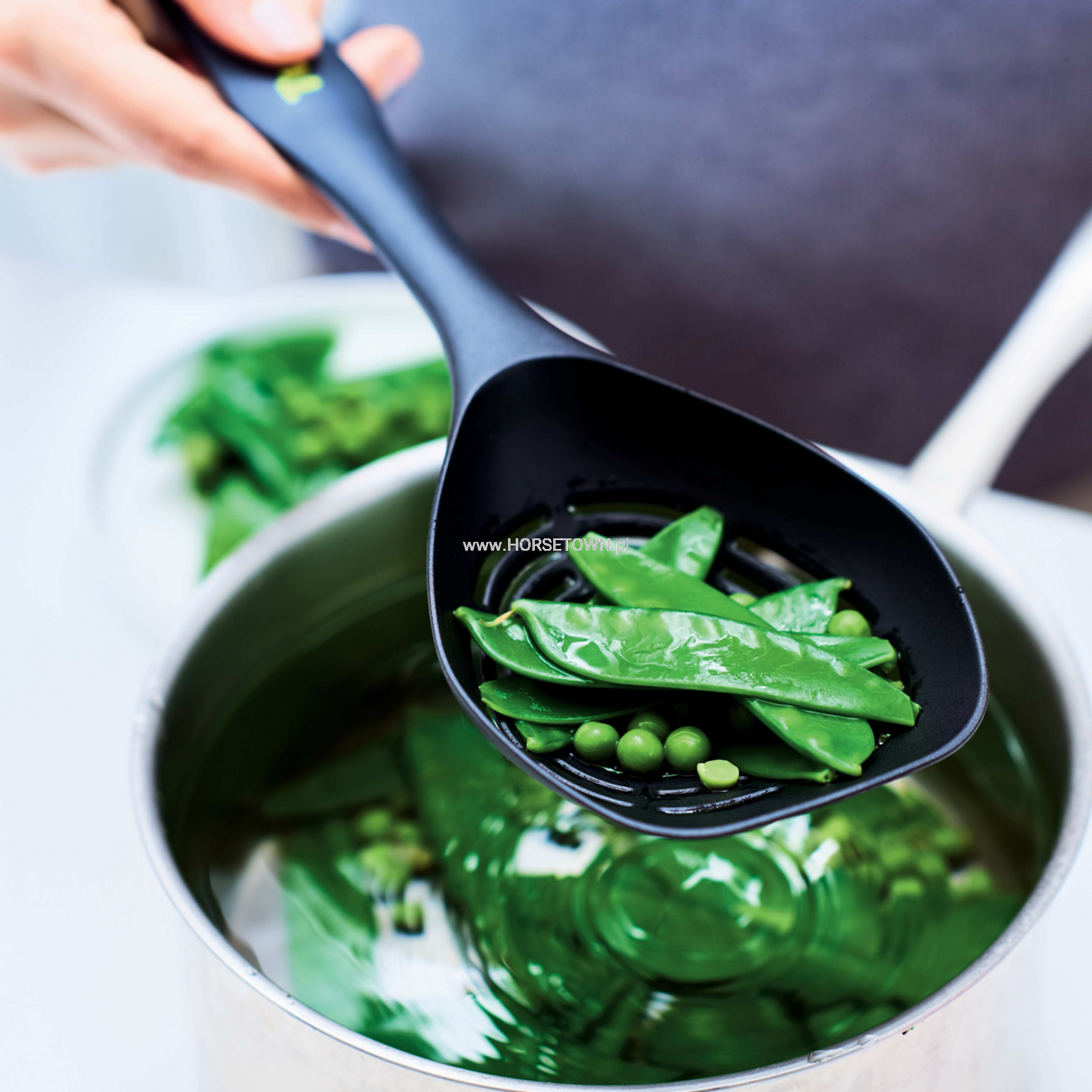 Długie otwory szybko i bezpiecznie odprowadzają nadmiar płynu z żywności, a długi uchwyt trzyma ręce z dala od gorących płynów.