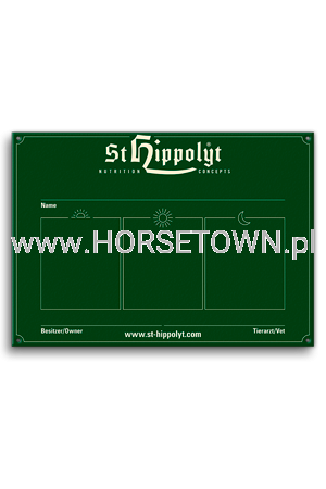Tabliczka na boks umożliwiająca rozpisanie dawki żywieniowej na poszczególne posiłki. Tabliczka posiada miejsce na dane kontaktowe właściciela zwierzęcia. Ułatwia obsłudze karmienie i ogranicza ryzyko pomyłek.