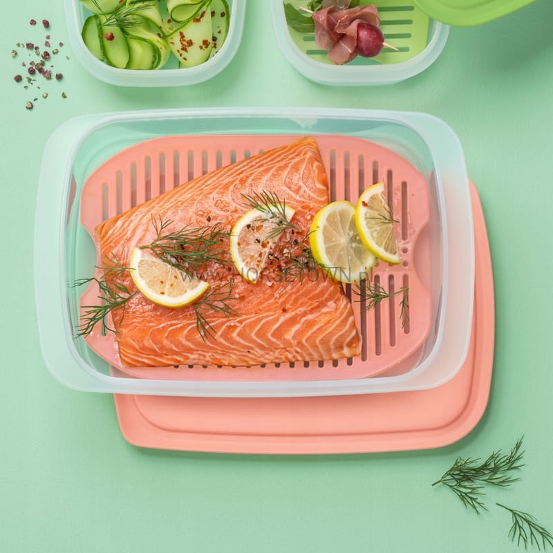 Zestaw składa się z pojemnika OPTIMA o pojemności 1,5 litra, zamknięcia oraz rusztu. Pojemnik o pojemności 1,5 l jest idealny na świeże kiełbasy i produkty mięsne, kiełbasy, kabanosy i sery. Dzięki świeżej kratce Twoje jedzenie jest smaczne i suche. Dzięki temu mięso lub kiełbasa pozostają świeże podczas transportu. Możesz również użyć pojemnika jako pojemnika na bułkę tartą. Przechowuj panierowane sznycle w lodówce, aż będą gotowe do gotowania.