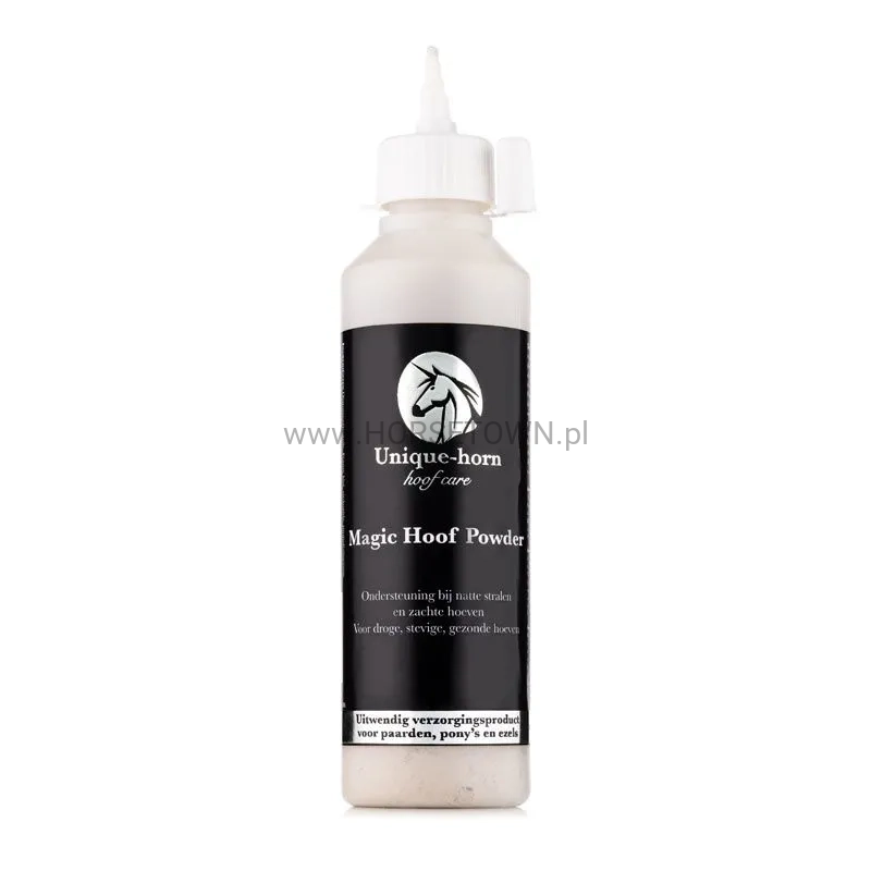 Unique-horn Magic Hoof Powder to unikalny produkt, który został specjalnie opracowany, aby wspierać konie w przypadku gnijących strzałek i miękkich kopyt. Proszek ma działanie wysuszające, pomagając w ten sposób kopytom stać się suchszymi i twardszymi.