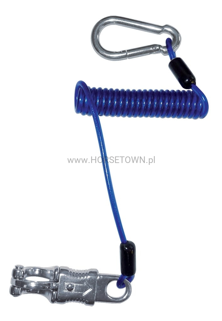 Wykonany z długiej linki poliuretanowej zwiniętej w spiralę. Idealny dla koni odsadzających się jak również do transportu. Mocne okucia ze stali nierdzewnej. Z jednej strony zakończony bezpiecznym karabińczykiem, z drugiej zwykłym karabinkiem.