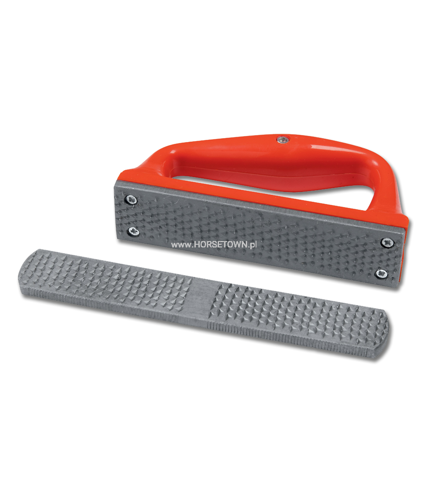Dwuczęściowy zestaw tarników do kopyt. W zestawie znajduje się lekki tarnik do kopyt o grubych zębach z anatomicznie ukształtowaną rączką z PCV oraz mini tarnik do kopyt z grubymi i drobnymi zębami, bez rączki.