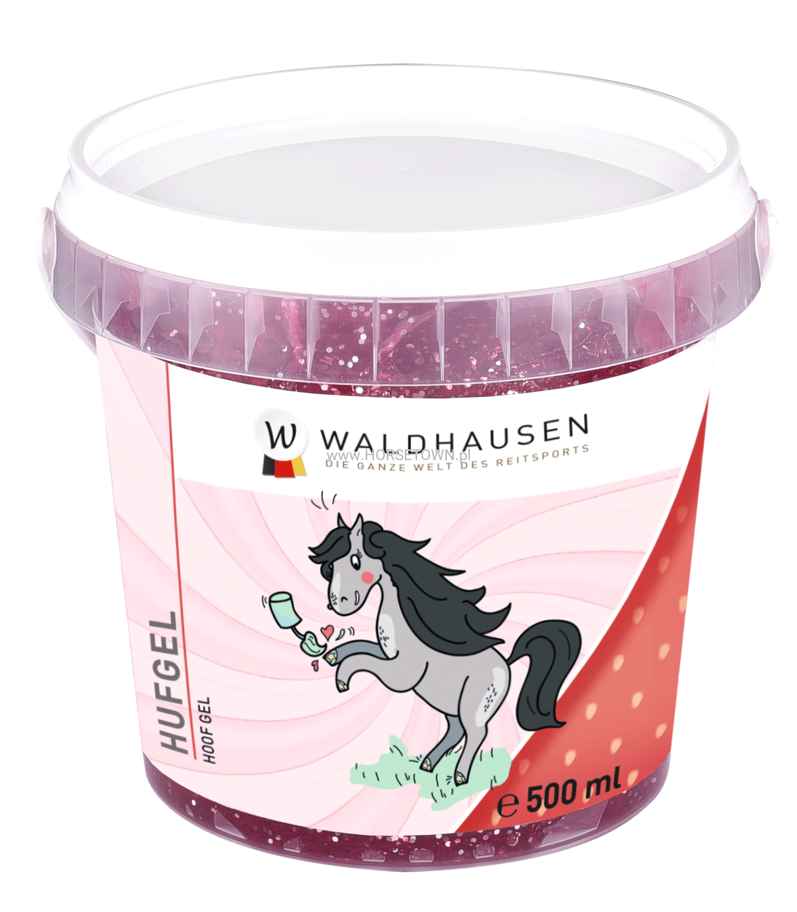 Różowy żel do kopyt o zapachu truskawkowo-waniliowym. Reguluje równowagę wilgoci, zapewnia zdrowy wzrost kopyt i utrzymuje ich elastyczność.